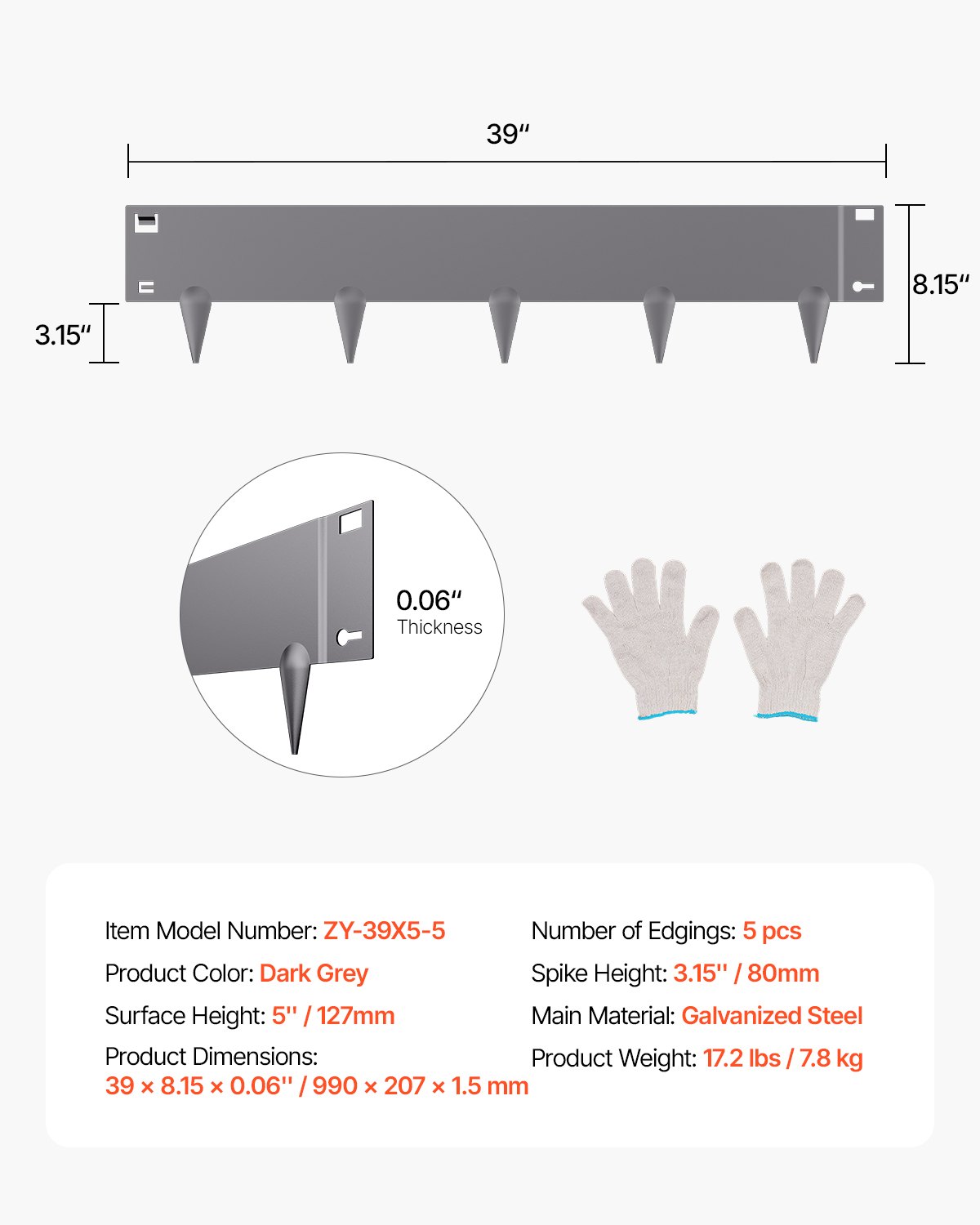 Broj rubova: 5 kom, Boja proizvoda: Tamno siva, Težina proizvoda: 7,8 kg, Glavni materijal: Pocinčani čelik, Visina šiljaka: 80 mm, Broj modela artikla: ZY-39X5-5, Visina površine: 127 mm, Dimenzije proizvoda: 990 x 207 x 1,5 mm