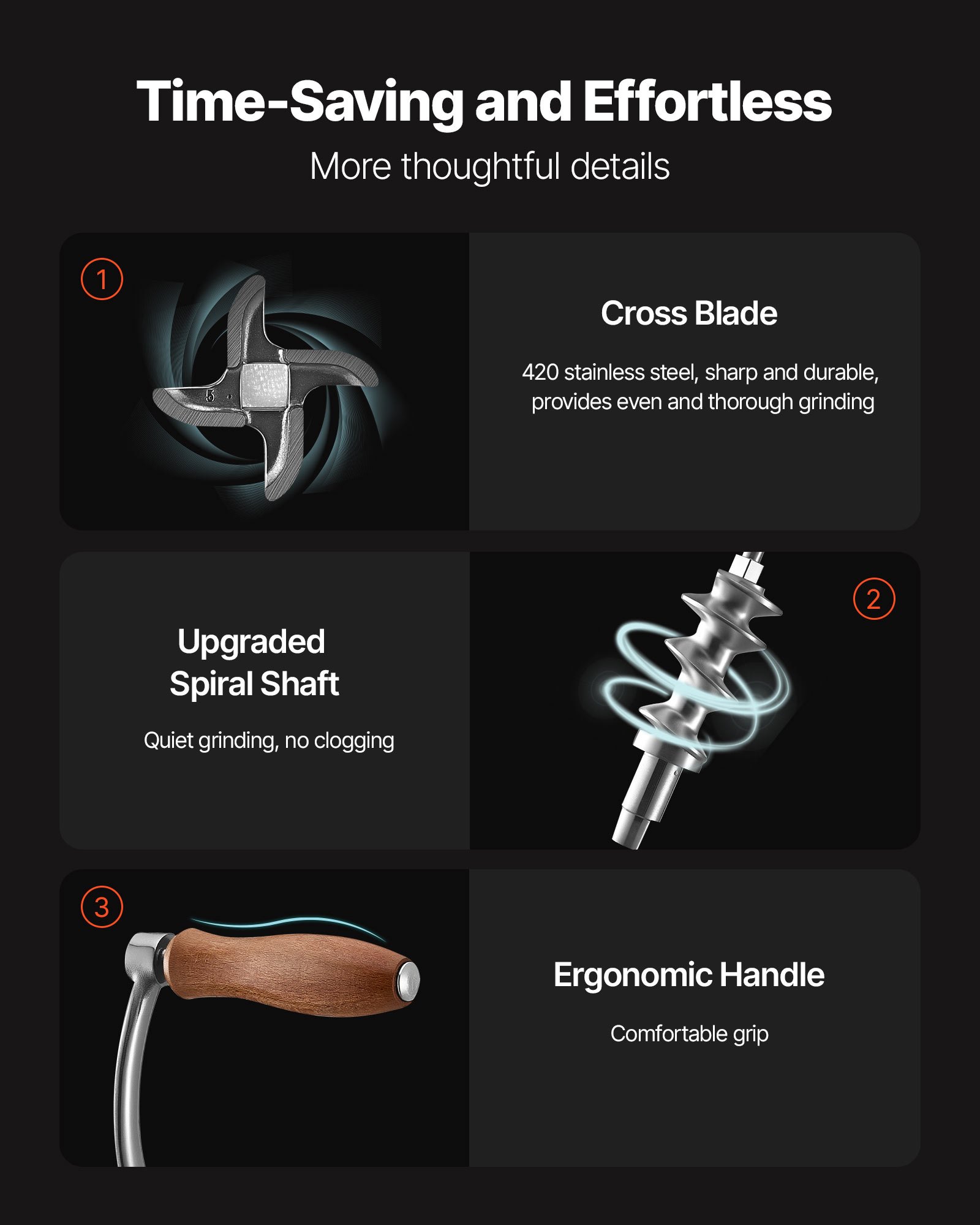 Promjer otvora ploče za meso: 4,5 mm i 8 mm, Neto težina: 1,9 kg, Broj modela artikla: br. 5, Materijal kućišta: nehrđajući čelik 304, Kalibar: #5, Način montaže: stezaljka za stol, Dimenzije proizvoda: 285 x 85 x 225 mm