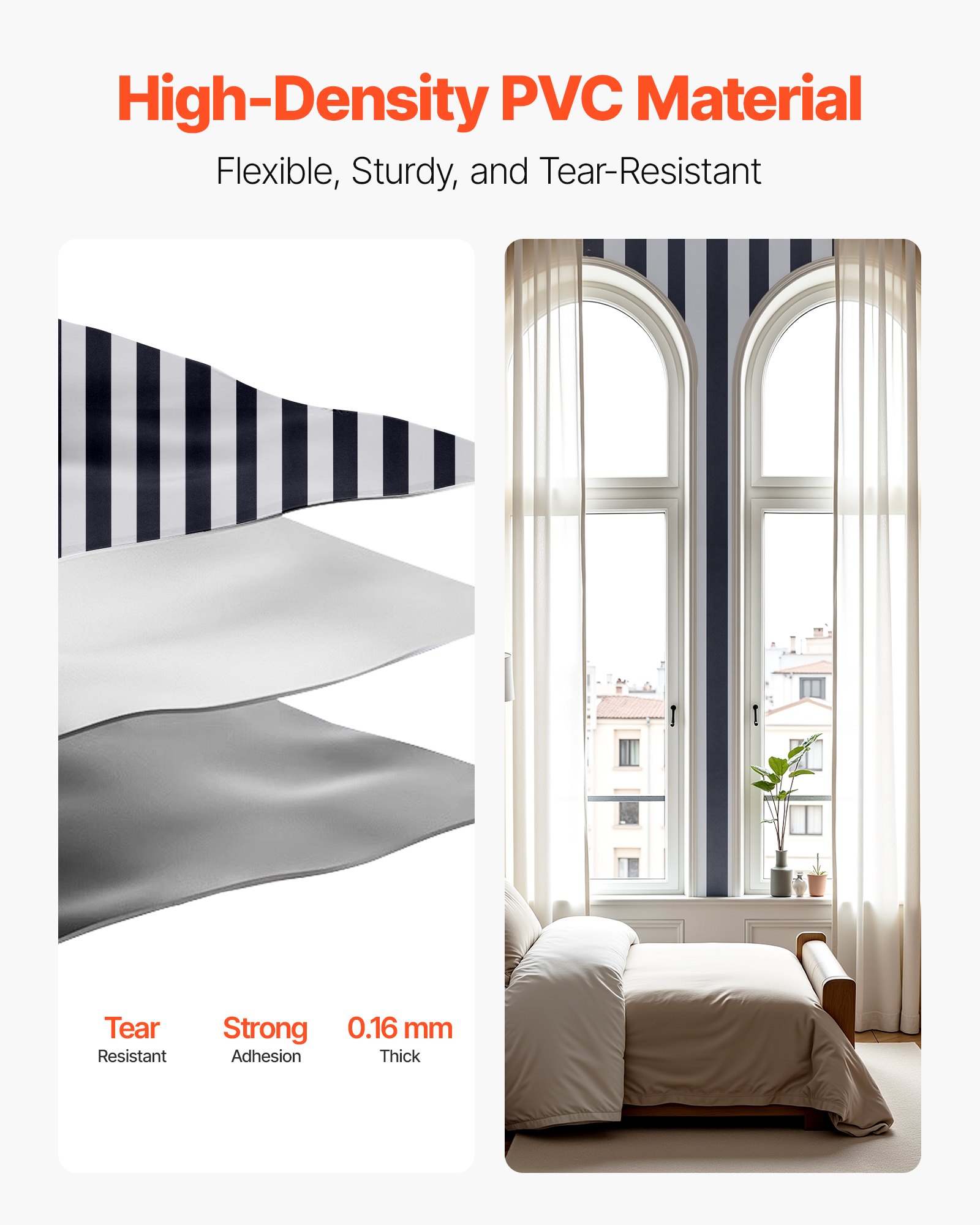 VEVOR Samoljepljive tapete, 45 cm x 15 m, Zidna tapeta, Ljepljiva folija s crno-bijelim prugama, Vodootporna, Folija za namještaj, Dekorativna vinilna rola za spavaću sobu, kuhinju, ured, kupaonicu