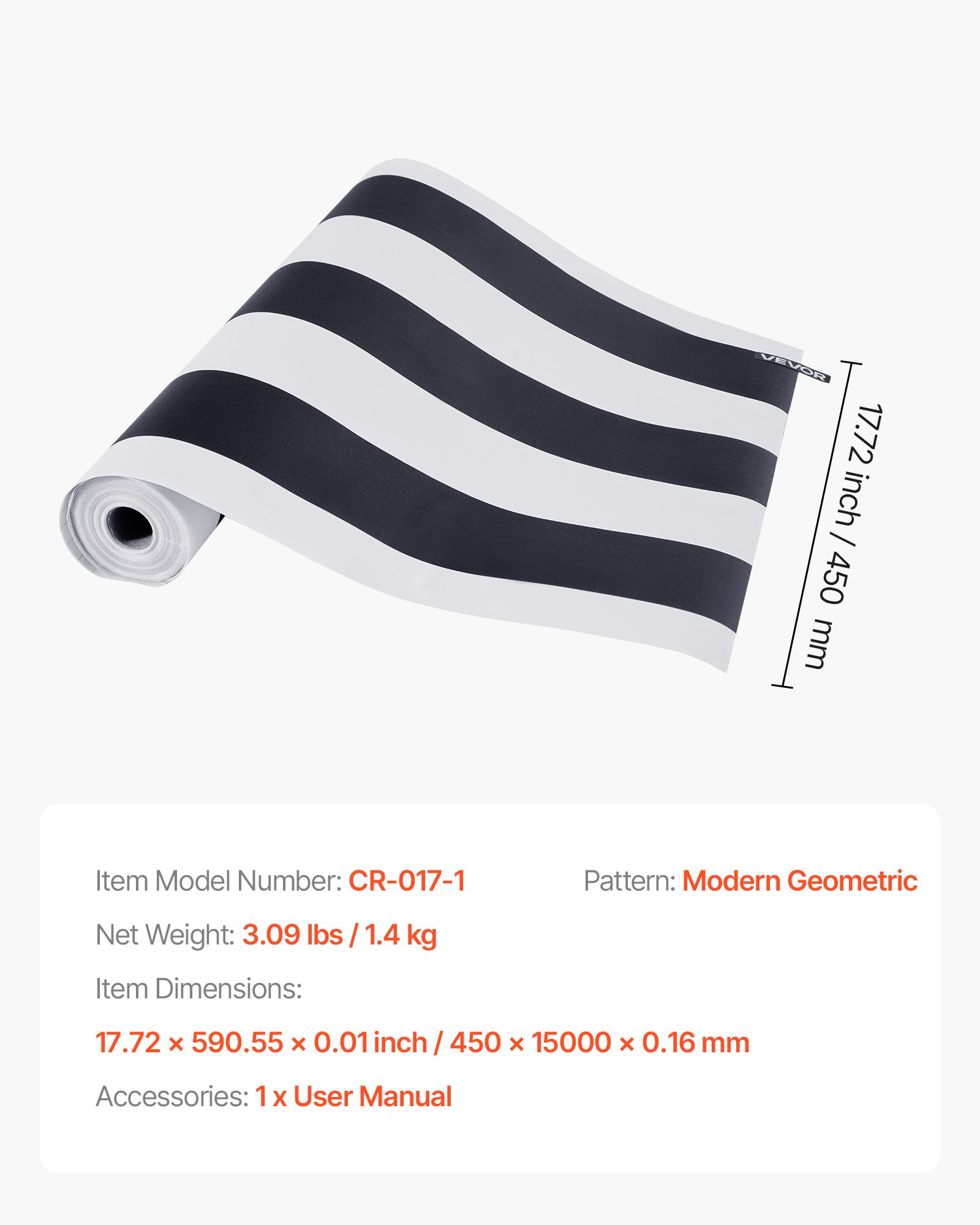 Dimenzije artikla: 17,72 x 590,55 x 0,01 in / 450 x 15000 x 0,16 mm, Uzorak: Moderni geometrijski, Neto težina: 3,09 lbs / 1,4 kg, Glavni materijal: PVC, Boja: Crno-bijela, Broj modela artikla: CR-017-1, Veličina role (Š x D): 17,72 x 590,5 in / 45 cm x 15 m