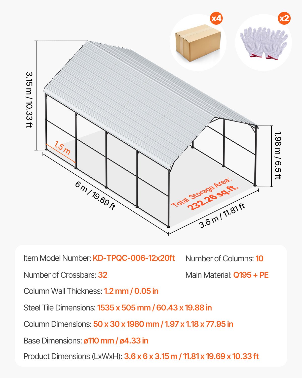 Glavni materijal: Q195 + PE,Dimenzije stupa: 50 x 30 x 1980 mm / 1,97 x 1,18 x 77,95 in,Debljina stijenke stupa: 1,2 mm / 0,05 in,Težina proizvoda:,Dimenzije čeličnih pločica: 1535 x 505 mm / 60,43 x 19,88 in,Dimenzije proizvoda (D x Š x V): 3,6 x 6 x 3,15 m / 11,81 x 19,69 x 10,33 ft,Broj prečki: 32,Dimenzije baze: ø110 mm / ø 4,33 in,Karton 3: Neto težina 38 kg / 83,78 lbs, Kutija 2: Neto težina 50 kg, Broj modela artikla: KD-TPQC-006-12x20ft, Kutija 1: Neto težina 45,8 kg / 101,98 lbs, Broj stupaca: 10