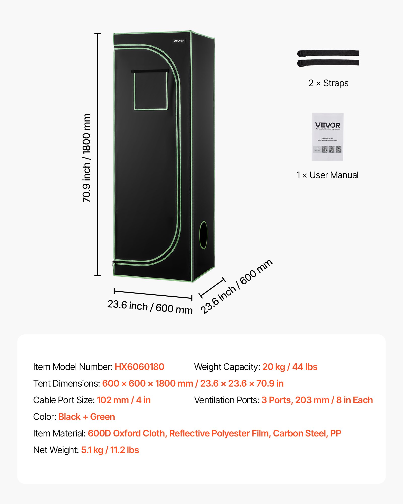 Veličina kabelskog priključka: 102 mm / 4 in, Materijal predmeta: 600D Oxford tkanina, reflektirajuća poliesterska folija, ugljični čelik, PP, Ventilacijski otvori: 3 otvora, svaki 203 mm / 8 in, Neto težina: 5,1 kg / 11,2 lbs, Dimenzije šatora: 600 x 600 x 1800 mm / 23,6 x 23,6 x 70,9 in, Boja: Crna + Zelena, Broj modela predmeta: HX6060180, Nosivost: 20 kg / 44 lbs