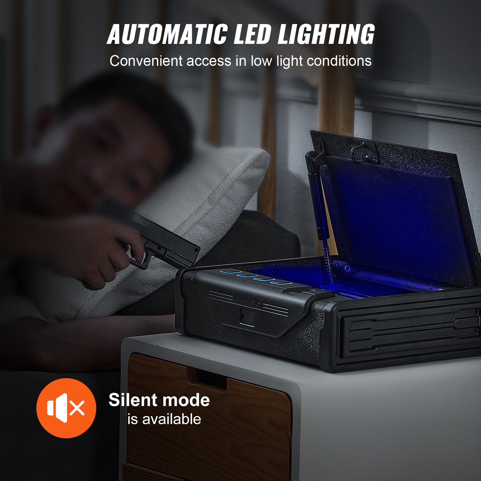 VEVOR sef za pištolj, prijenosni sef za pištolj, futrola za 2 pištolja, zaključavanje otiskom prsta, ključem ili lozinkom, hladno valjani čelik, 282 x 180,1 x 50 mm, zidni ormarić za pištolj, trostruki mehanizam zaključavanja, poboljšana vidljivost i udobnost, vrhunska zaštita, sigurna ugradnja, prostran, a opet kompaktan, vrhunski tvrdi čelik, unutarnje dimenzije: 11,1 x 7,09 x 1,97 inča / 282 x 180,1 x 50 mm, glavni materijal: hladno valjani čelik Q235, boja: crna, otvaranje vrata: automatsko, kapacitet: 2 pištolja + spremnik, težina proizvoda: 10,65 lbs / 4,65 kg, broj modela artikla: SS-SQH01