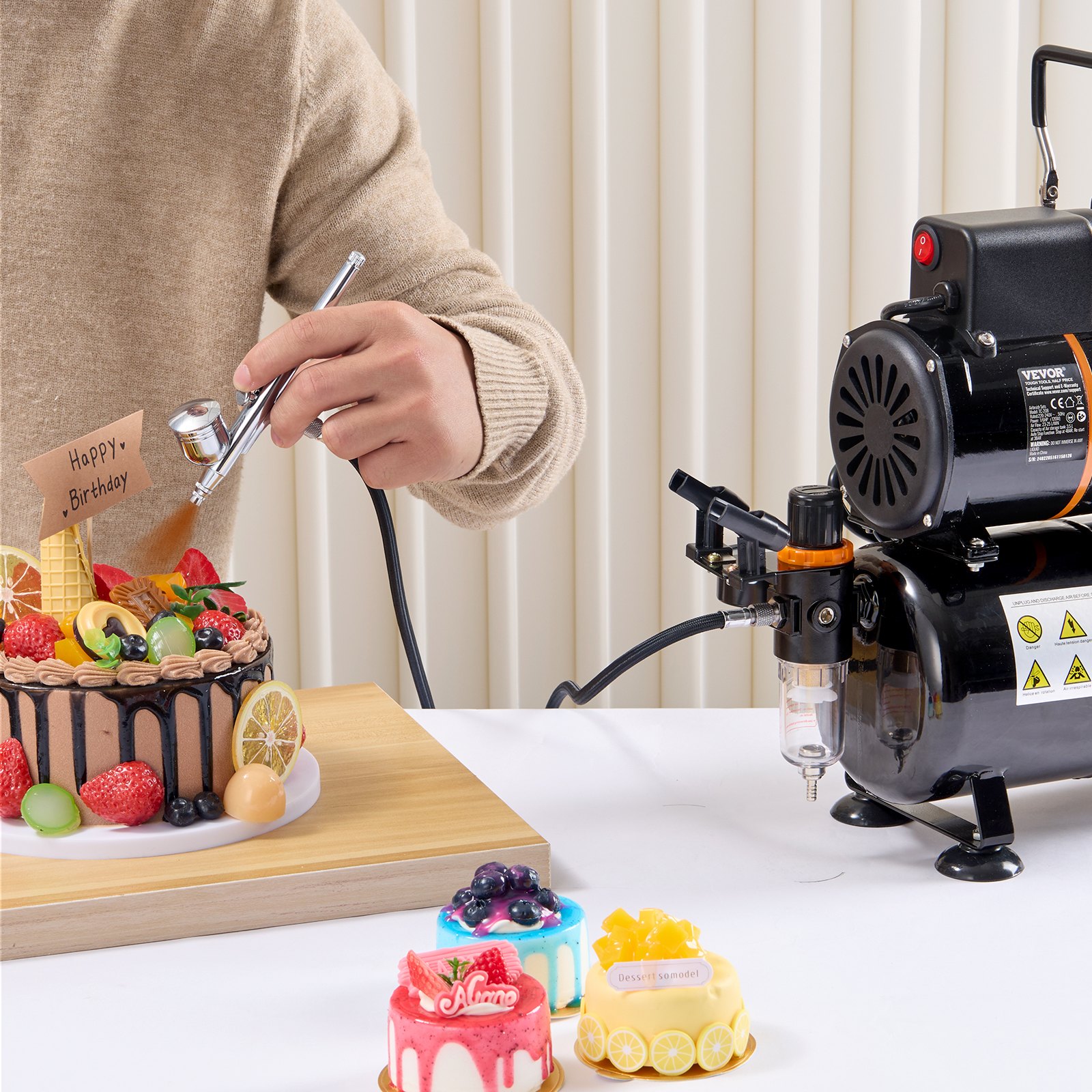 set airbrusha, set kompresora s dvostrukim ventilatorom i spremnikom zraka od 3,5 l, set airbrusha s vrhom od 0,3 mm, stalak, kotačić za miješanje boje, set kistova za čišćenje, kolačić za umjetničke nokte