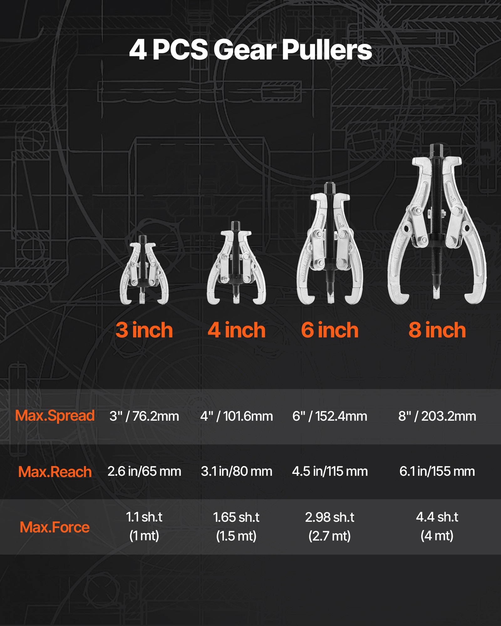 VEVOR set izvlakača zupčanika, 3/4/6/8 inčni izvlakač ležajeva s 3 čeljusti i reverzibilnim čeljustima, alat za izvlačenje remenica s 2/3 čeljusti, za uklanjanje remenica, ležajeva zupčanika i zamašnjaka