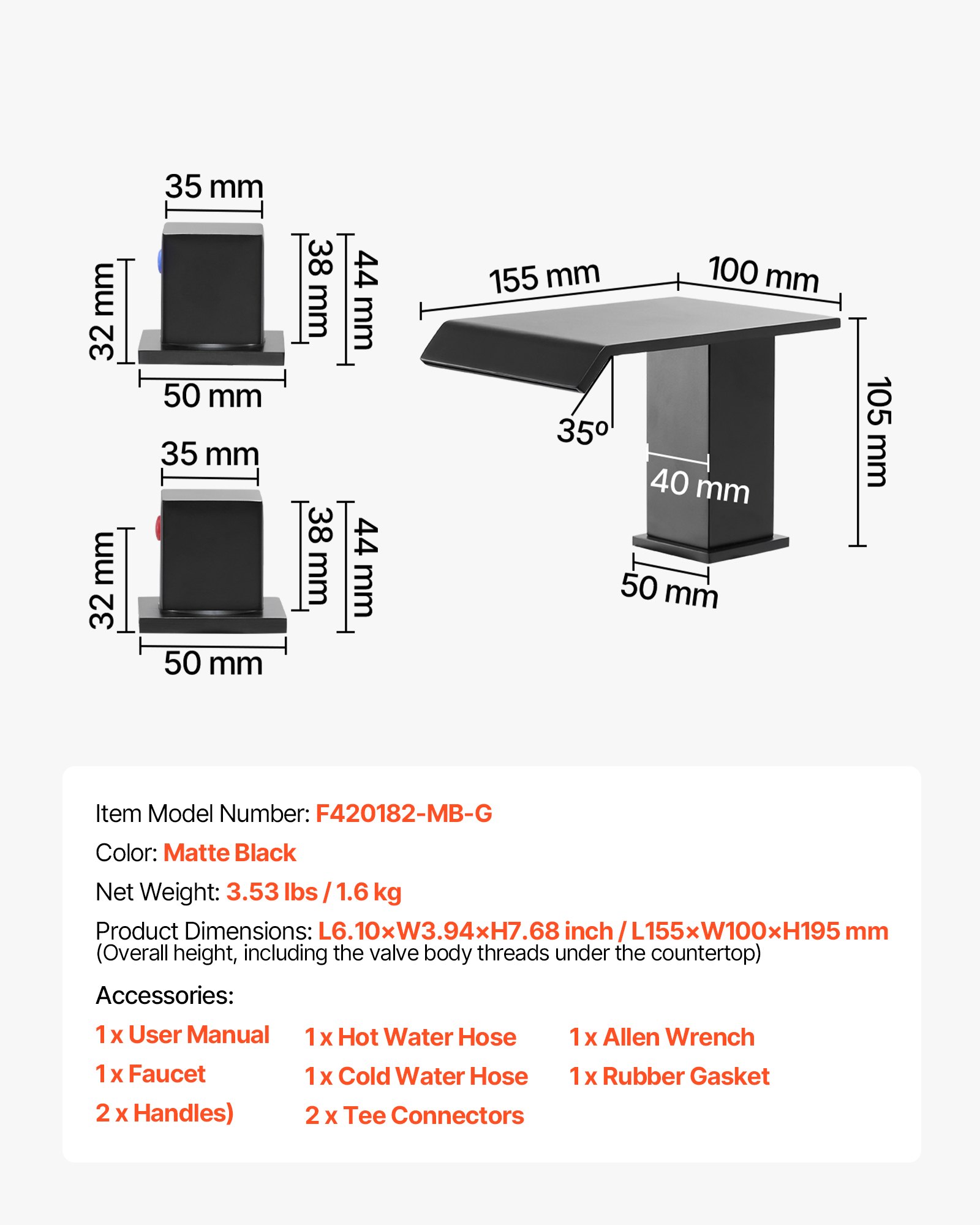 Neto težina: 1,6 kg, Boja: Mat crna, Broj modela artikla: F420182-MB-G, Dimenzije proizvoda: 155 x 195 x 100 mm