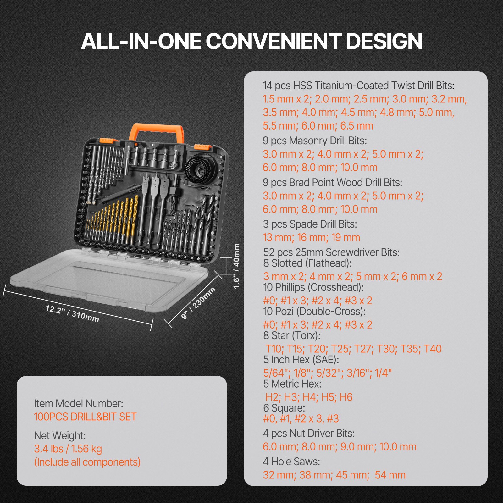 Veličina kutije za pohranu: 12,2 x 9 x 1,6 inča / 310 x 230 x 40 mm, Neto težina: 3,4 lbs / 1,56 kg (uključujući sve komponente), Broj modela artikla: 100 KOMADA SETA SVRDILA I BITOVA