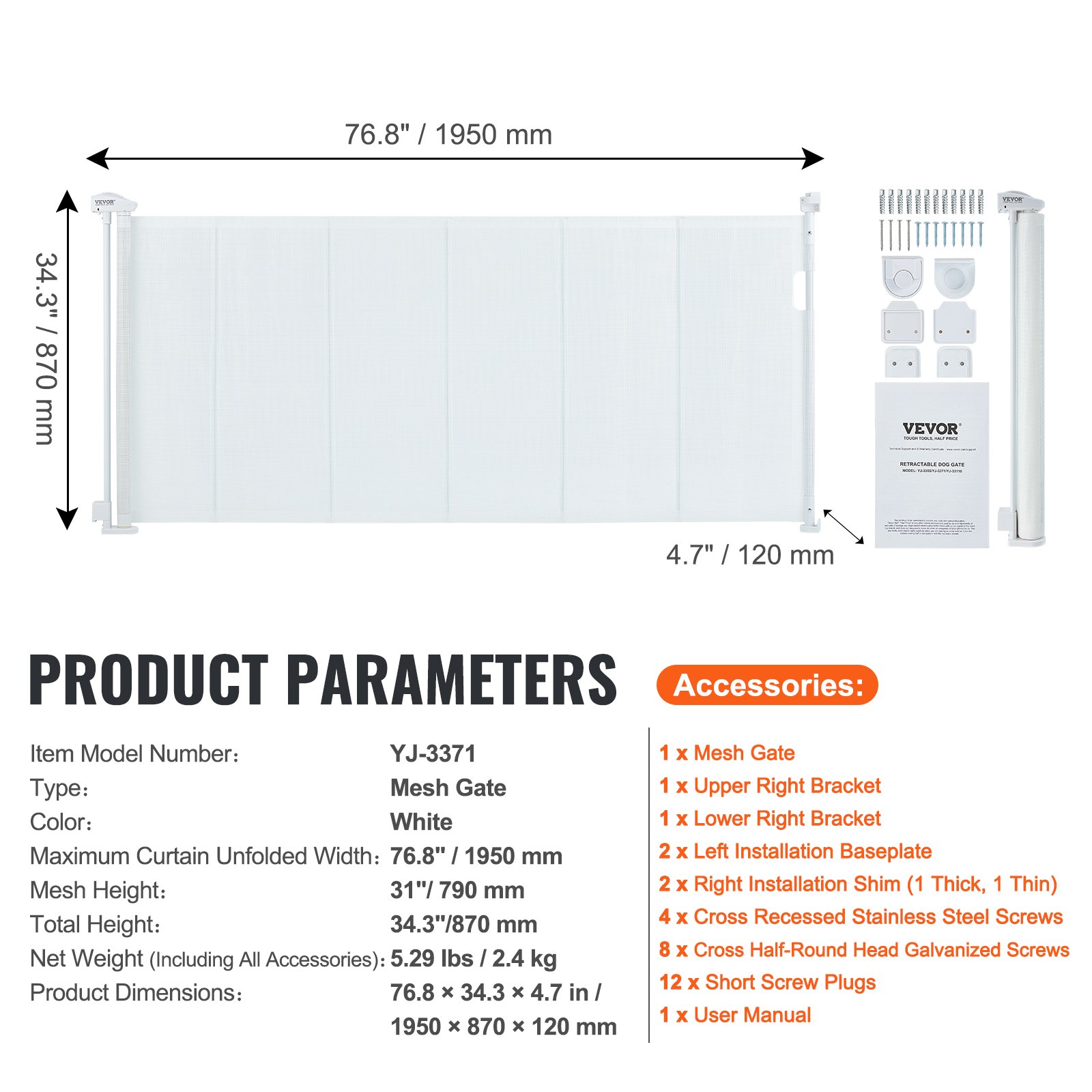 Boja: Bijela, Neto težina (uključujući sav pribor): 5,29 lbs / 2,4 kg, Maksimalna širina proširene zavjese: 76,8 in / 1950 ± 10 mm, Ukupna visina: 34,2 in / 870 ± 8 mm, Vrsta: Vrata, Visina mreže: 31 in / 790 ± 8 mm, Dimenzije proizvoda: 76,77 x 34,25 x 4,72 in / 1950 x 870 x 120 mm (rasklopljeno), Broj modela artikla: YJ-3371