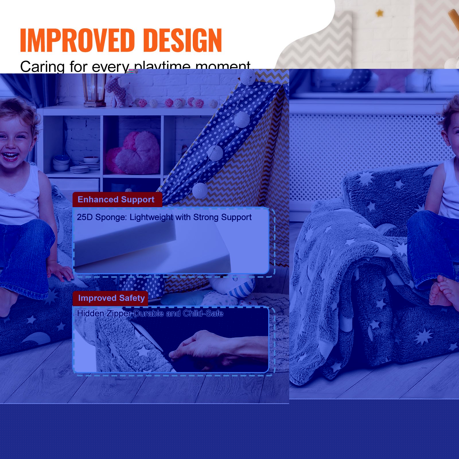 VEVOR Sklopiva dječja sofa, 610 x 430 x 400 mm, Dječja sofa, Mekana sofa za dječju sobu, Sofa za igru, Ugodni kutak za 1 dijete, Dječja fotelja, Dječji namještaj, Dječja stolica, Siva, Fotelja za spavanje, 20 kg, Funkcija kreveta