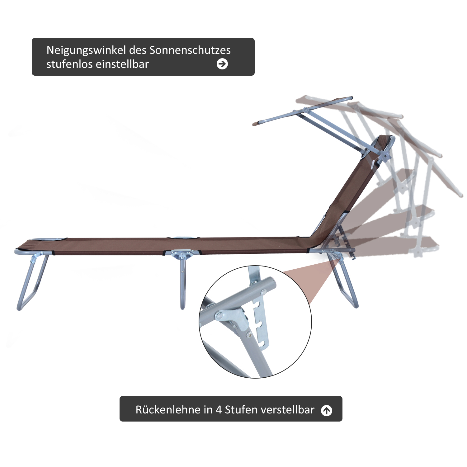 Ova udobna vrtna ležaljka sa sjenilom i prozračnom navlakom od tkanine nudi savršeno mjesto za opuštanje u vašem vrtu ili na terasi. Materijali korišteni za ovu ležaljku jednostavni su za održavanje i izdržljivi. Naslon se može podesiti u četiri položaja, a integrirana sjenila pružaju ugodnu hladovinu. Kada idete na odmor, ležaljku za kampiranje možete jednostavno sklopiti i prevesti je na način koji štedi prostor. Opis: ✔ Pogodno za vanjsku upotrebu, primjerice u vrtu, na balkonu ili tijekom kampiranja ✔ Okvir s praškastim premazom nudi visoku stabilnost ✔ Navlaka sjedala izrađena od izdržljive oxfordske tkanine ✔ Naslon se može podesiti u 4 položaja ✔ S uklonjivom sjenilom ✔ Kut nagiba sjenila kontinuirano se podešava ✔ 3 potporne noge osiguravaju optimalnu stabilnost i udobnost ✔ Sklapa se za uštedu prostora u pohrani i jednostavan transport Tehnički podaci: ✔ Materijal: Metal, oxfordska tkanina ✔ Boja: Smeđa ✔ Maks. dimenzije ležaljke (bez tende): D187 x Š58 x V36 cm