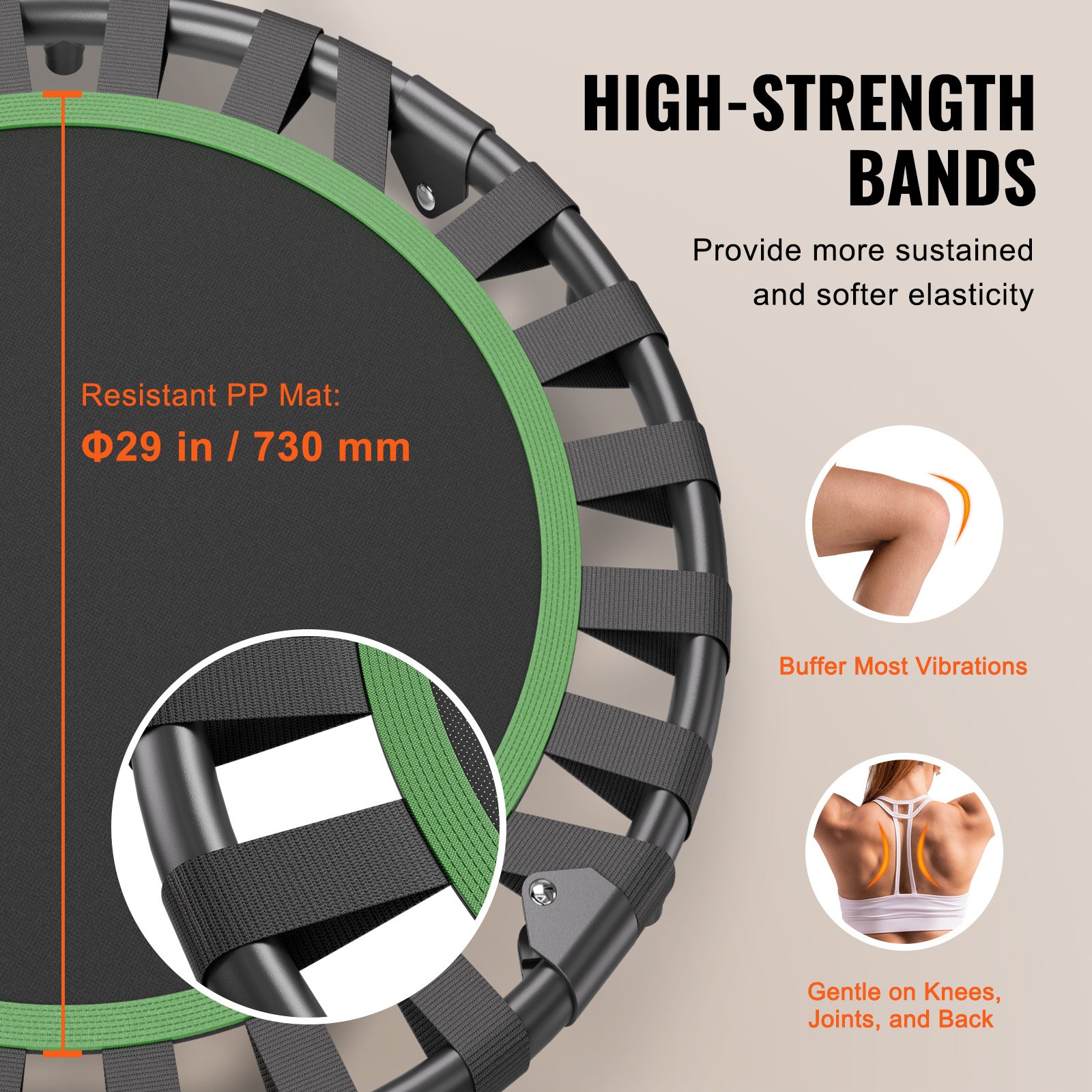 Promjer: 934 mm, Boja: Crna i zelena, Nosivost: 100 kg, Broj remena: 24, Neto težina: 4,65 kg, Materijal: Vrhunske čelične cijevi + PP prostirka + remeni, Broj modela artikla: TX-B6232B-36in