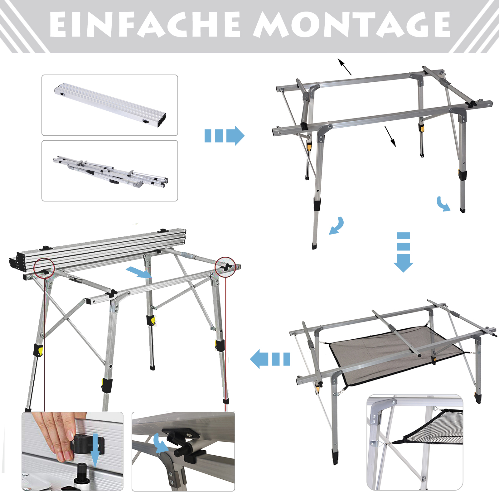 Bilo da se radi o pikniku ili roštilju, naš lako prenosivi sklopivi stol čini to lakim. Podesiva visina prilagođava se vašim potrebama, a ploča stole nudi dovoljno prostora za piće i hranu. Mrežasta ploča ispod pruža dodatni prostor za pohranu. Uživajte u sljedećem izletu s ovim jednostavnim sklopivim stolom. Opis: ✔ Idealno za piknike, zabavu ili kampiranje ✔ Puno mjesta za 4 osobe ✔ Lagan, ali čvrst aluminijski okvir pruža stabilnost ✔ Podesiva visina prema vašim potrebama ✔ Uklonjiva mrežasta pohrana ✔ Lako sklopivi stol s torbom za nošenje ✔ Protuklizne noge za dodatnu stabilnost ✔ Potrebna montaža Specifikacije: ✔ Materijal: Aluminij, mrežasta tkanina ✔ Dimenzije: D120 x Š69 x V59-78 cm ✔ Dimenzije (ploča stola): D120 x Š69 x D1 cm ✔ Dimenzije (sklopljeno): D121 x Š17 x Visina 11 cm ✔ Neto težina: 6,5 kg ✔ Nosivost: 40 kg (ploča stola), 3 kg (mreža) ✔ Boja: Srebrna ✔ Opseg isporuke: ✔ 1 x Sklopivi stol ✔ 1 x Torba za nošenje ✔ 1 x Upute za upotrebu