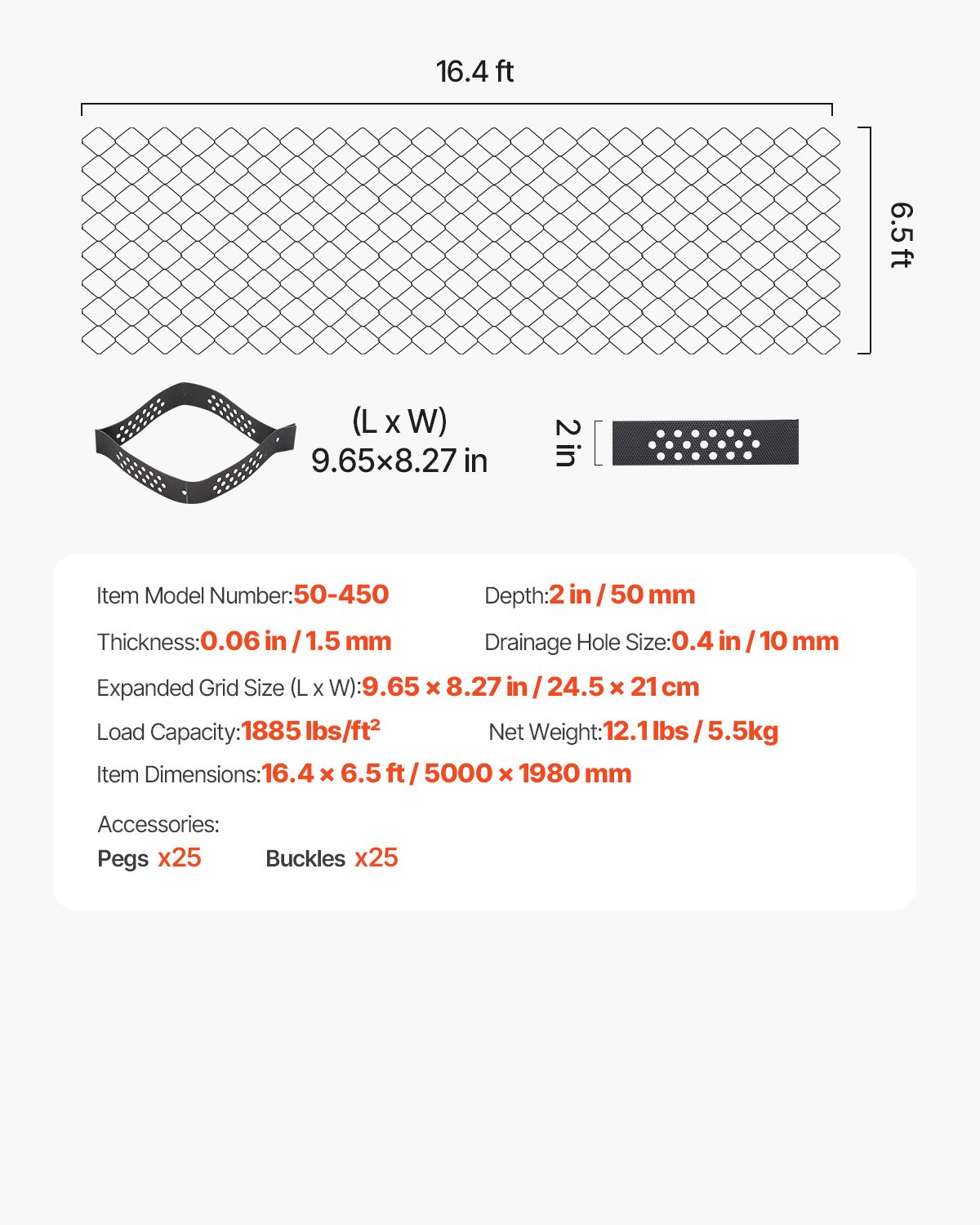Nosivost: 1885 lbs/ft², Veličina proširene mreže (D x Š): 9,65 x 8,27 in / 24,5 x 21 cm, Debljina: 0,06 in / 1,5 mm, Dubina: 2 in / 50 mm, Dimenzije artikla: 16,4 x 6,5 ft / 5000 x 1980 mm, Neto težina: 5,14 kg, Veličina otvora za odvodnju: 0,4 inča / 10 mm, Broj modela artikla: 50-450