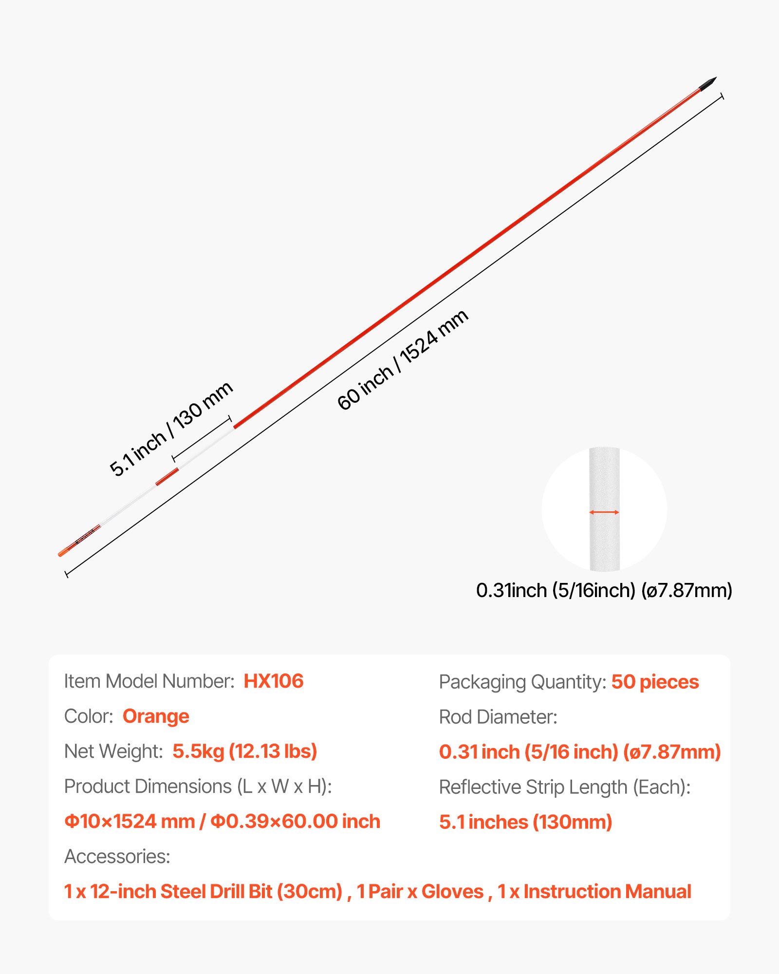 Broj reflektirajućih traka: 2 segmenta, Unutarnja struktura štapa: Šuplja, Neto težina: 5,5 kg (12,13 lbs), Materijal kapice štapa: PE, Promjer štapa: 0,31 in (5/16 in) (ø7,87 mm), Dimenzije proizvoda (D x Š x V): Φ10 x 1524 mm / Φ0,39 x 60,00 in, Veličina suženog vrha: Φ10 x 40 mm / Φ0,39 x 1,57 inča, Materijal reflektirajuće trake: Akril, Kapica uključena: Da (uključujući svrdlo i rukavice), Veličina šipke: Φ7,87 x 1470 mm / Φ0,31 x 57,87 inča, Boja: Narančasta, Broj modela artikla: HX106, Veličina svrdla: Φ8 x 300 mm / Φ0,31 x 11,81 inča, Duljina reflektirajuće trake (svaka): 5,1 inča (130 mm), Širina reflektirajuće trake: 130 mm / 5,12 inča, Veličina kapice šipke: Φ10 x 20 mm / Φ0,39 x 0,79 inča, Materijal šipke: Stakloplastika bez alkalija + nezasićena smola, Količina pakiranja: 50 komada, Materijal konusnog vrha: PE, Materijal svrdla: Vrh od legiranog čelika, Tijelo od kromiranog čelika