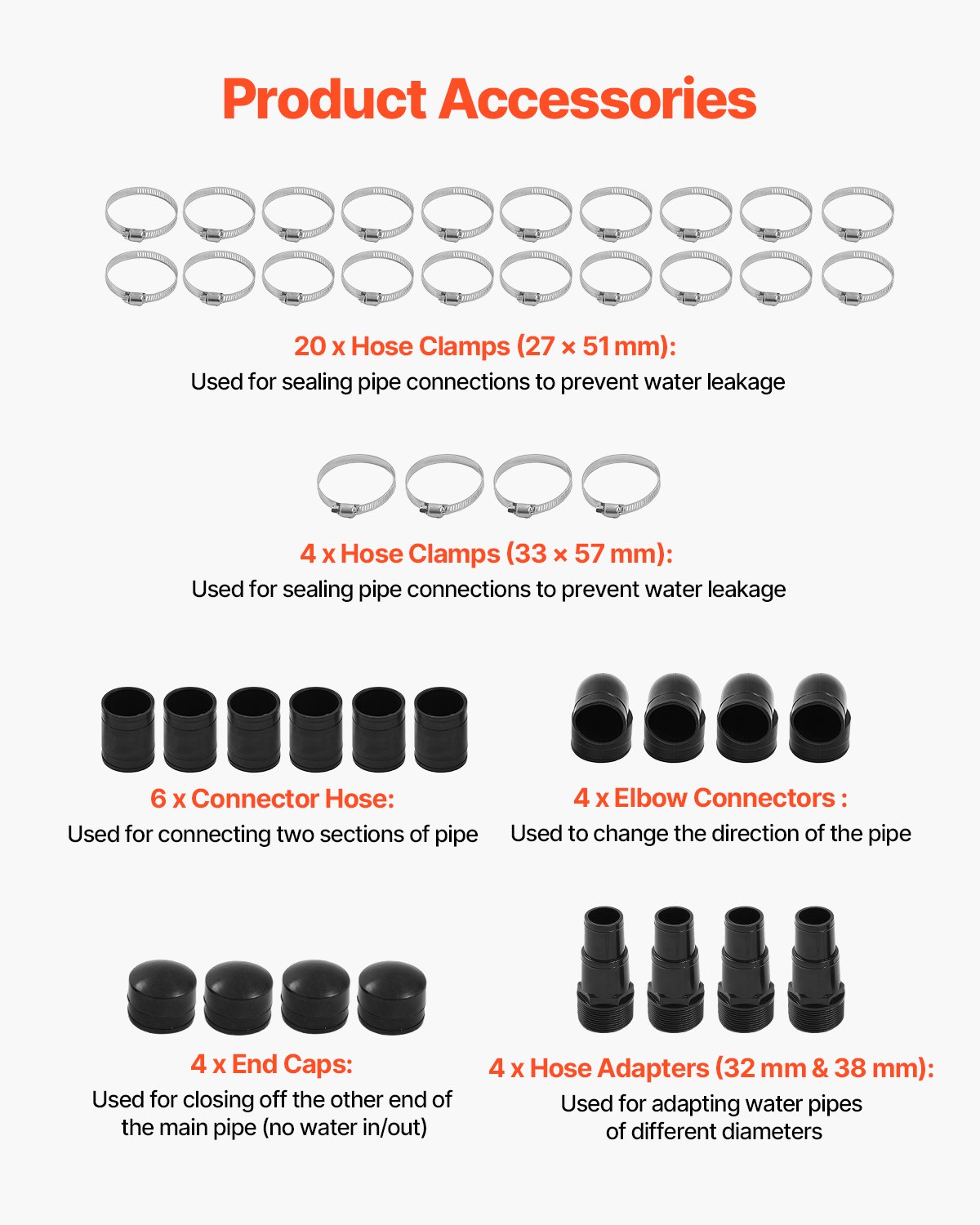 Veličina proizvoda: 33,46 x 240,16 in / 850 x 6100 mm, Glavna cijev (promjer): 2 in, Neto težina: 46,96 lbs / 21,3 kg, Boja: Crna, Nepropusnost za zrak: 1,2 bara, Broj modela artikla: 28032BX, Materijal: HDPE, Adapter za crijevo (promjer): 1,25/1,5 in