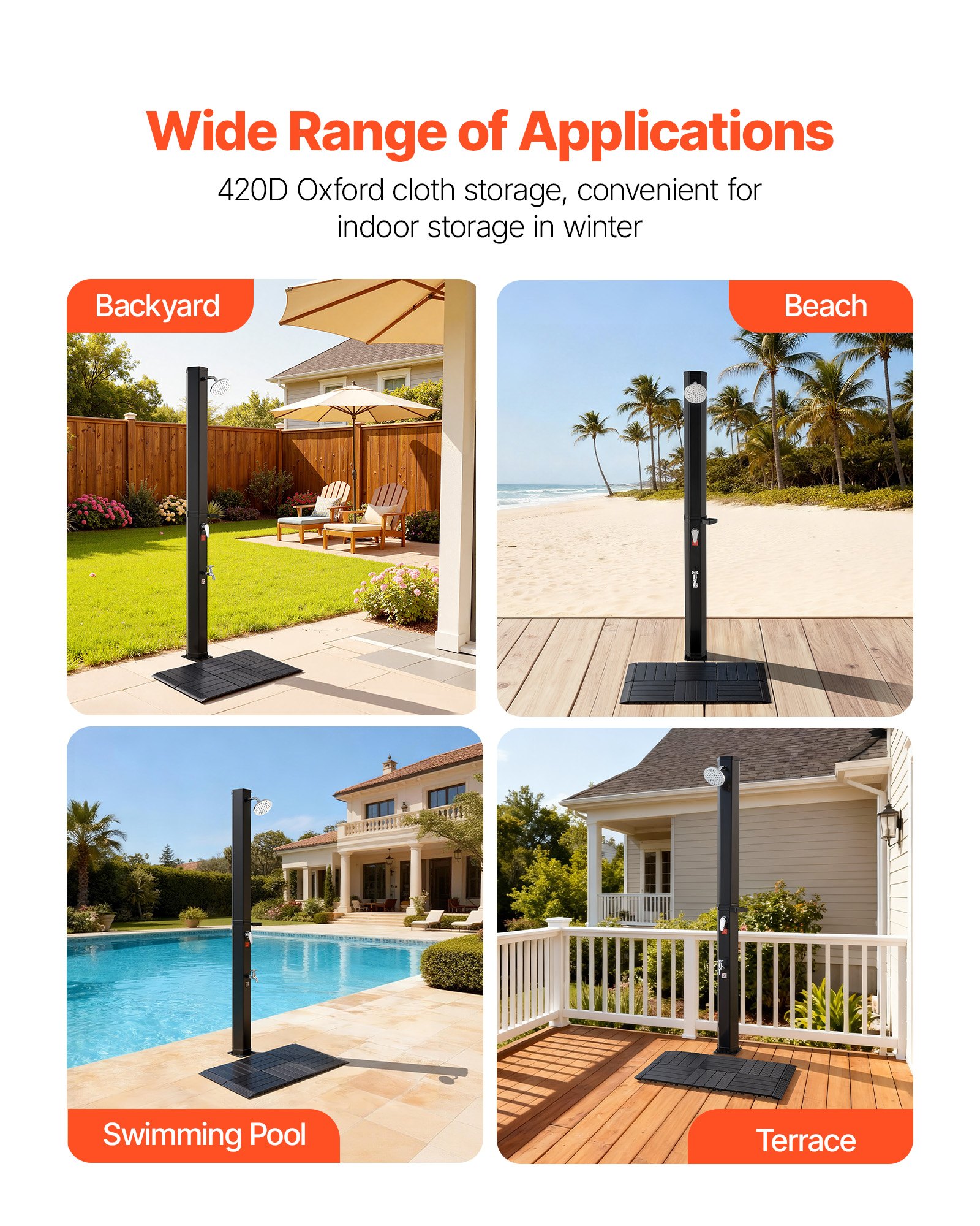 VEVOR Solarni tuš 35L, Vrtni tuš 2160 mm Vanjski tuš s osnovnom pločom i slavinom za noge, Tuš za bazen s regulacijom tople i hladne vode, Tuš za kampiranje za vrt, područje bazena, bazen na plaži, Crni