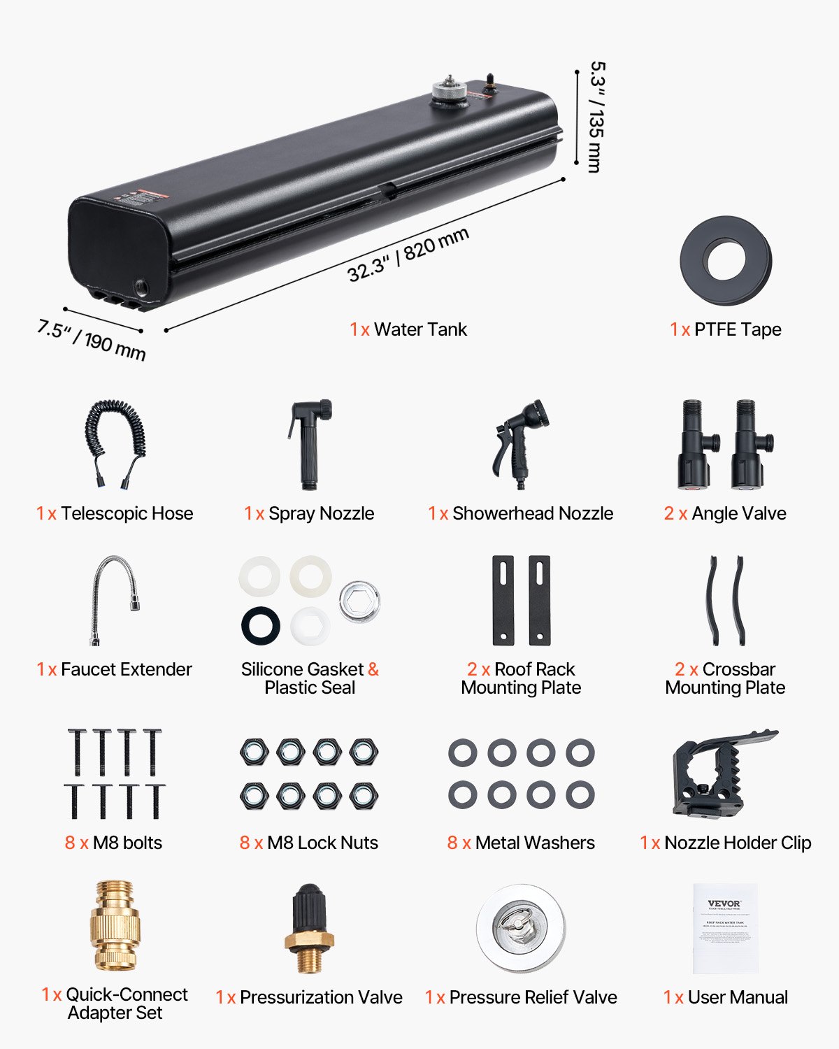 VEVOR Spremnik za vodu za krovni nosač, Spremnik za vodu za vozilo od 15 l s 2 zaštite od prskanja i T-utorom, Aluminijski spremnik s visokotlačnim priključkom, za prtljažnike, roll barove i prečke