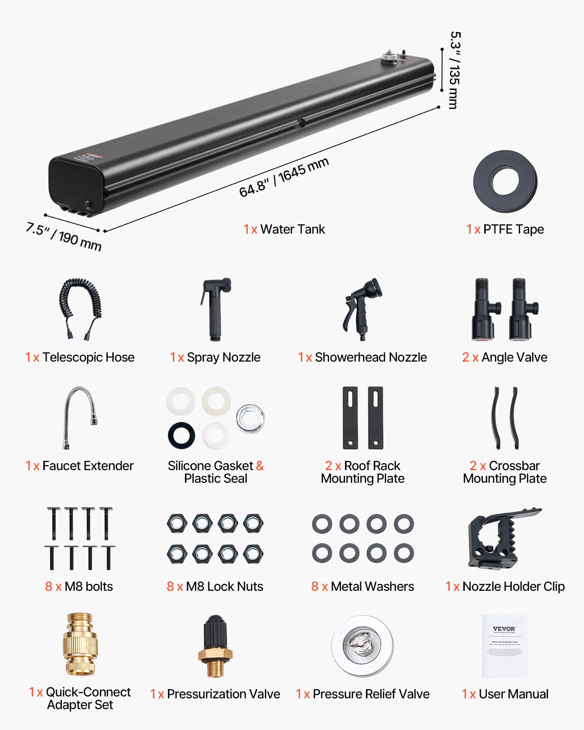 VEVOR Spremnik za vodu za krovni nosač, 30 l spremnika za vodu za vozilo s 2 zaštite od prskanja i T-utorom, aluminijski spremnik s visokotlačnim priključkom, za prtljažnike, roll barove i prečke