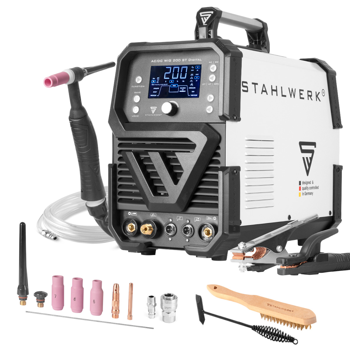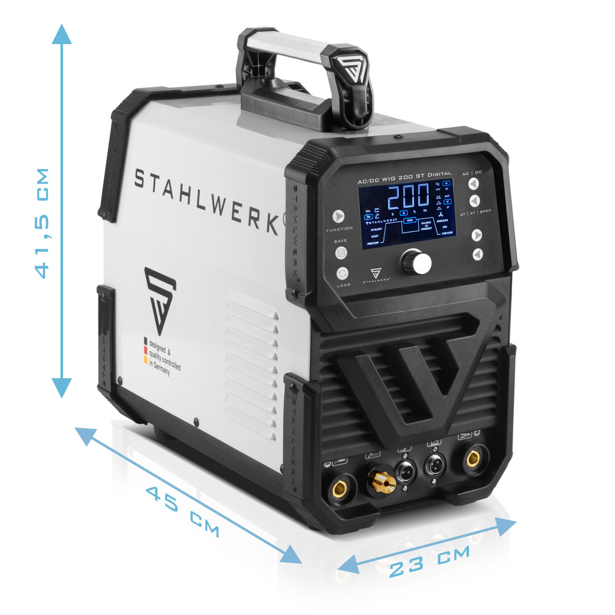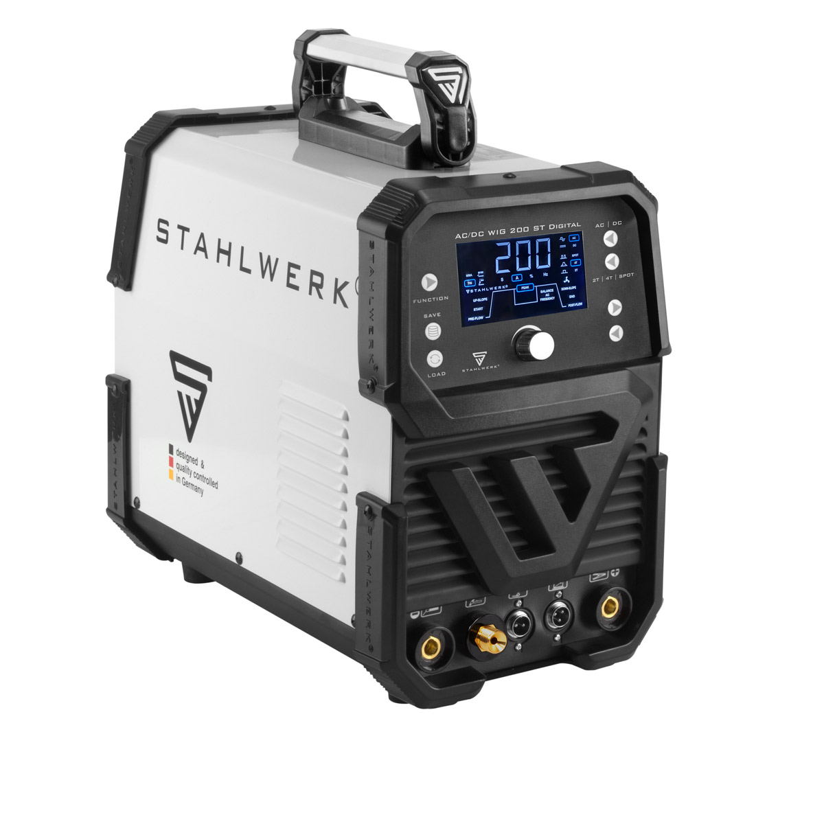 Novi STAHLWERK AC/DC WIG 200 ST Digital je svestrani TIG aparat za zavarivanje s integriranom funkcijom MMA/elektroničkog zavarivanja. Uz provjerene značajke kao što su beskontaktno HF paljenje, pametno hlađenje i zaštita od pregrijavanja, novi model nudi digitalni zaslon za precizniju kontrolu, poboljšanu jasnoću i jednostavnost korištenja, kao i dodatni daljinski priključak za upravljanje plamenikom WP26R (nije uključen). Uređaj ima funkciju točkastog zavarivanja, posebno pogodnu za tanke ploče karoserije u automobilskom sektoru. To osigurava precizne, ponovljive i konzistentne zavare. Funkcija točkastog zavarivanja također minimizira prijenos topline na obradak, što rezultira manjim izobličenjem. Nadalje, stroj nudi 2-taktni i 4-taktni način rada. Unatoč svojoj opsežnoj funkcionalnosti, ostaje jednostavan za upravljanje i kompaktan sa samo 13 kg.