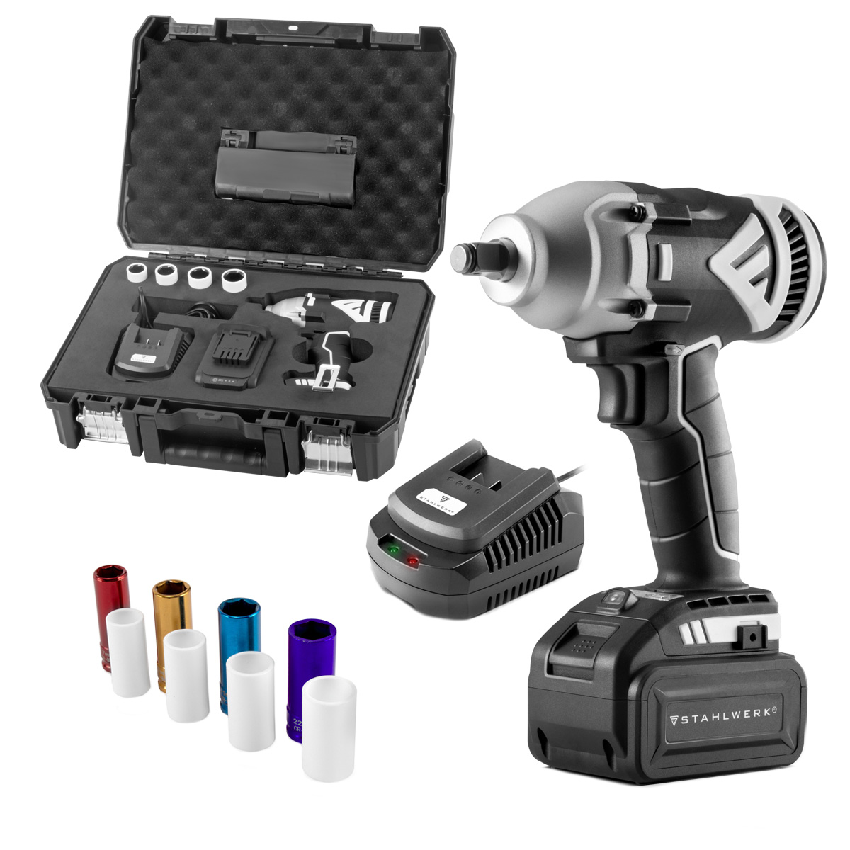 STAHLWERK ADS-20 ST akumulatorski udarni ključ radi praktički bez habanja zahvaljujući najnovijoj generaciji tehnologije bez četkica. Snažan 20-voltni sustav s najsuvremenijom litij-ionskom tehnologijom osigurava maksimalnu snagu za iznimno duge radne sesije. Ergonomska ručka, mala težina i izvrstan hvat omogućuju udoban rad, čak i tijekom dulje upotrebe. Ovaj akumulatorski alat ima maksimalni okretni moment od 500 Nm za snažno odvrtanje vijaka. Okretni moment zatezanja podesiv je u tri stupnja: 280 Nm / 350 Nm / 500 Nm. Udarni ključ ima pogon od 1/2 inča za jednostavnu izmjenu bitova. Visokokvalitetna torba za nošenje može se slagati i spajati zahvaljujući praktičnom klik sustavu.
