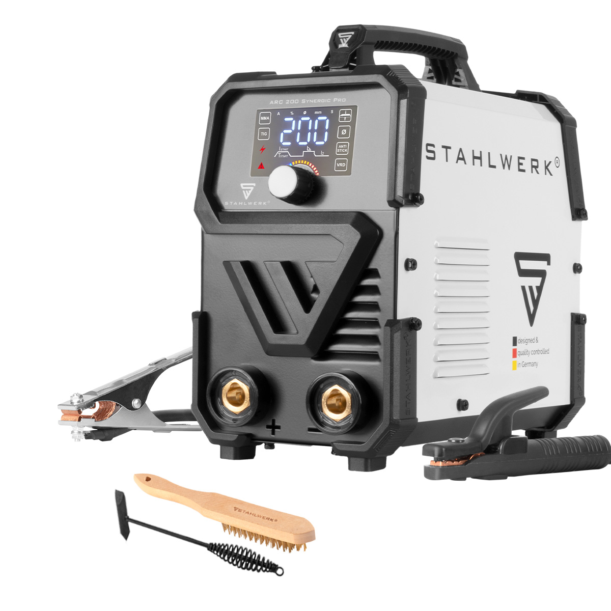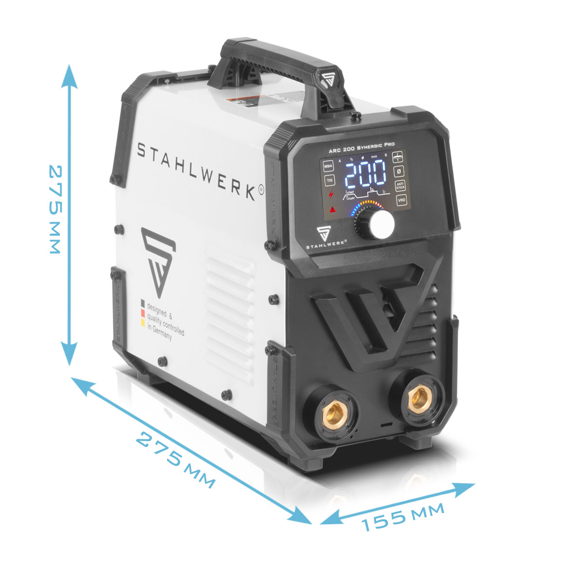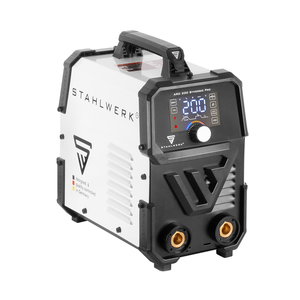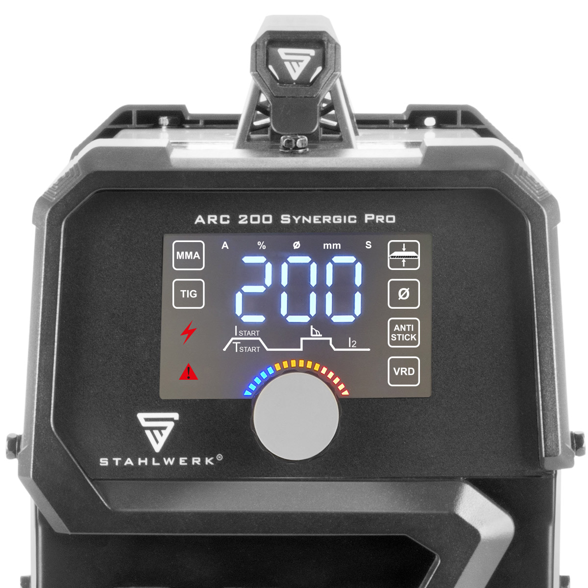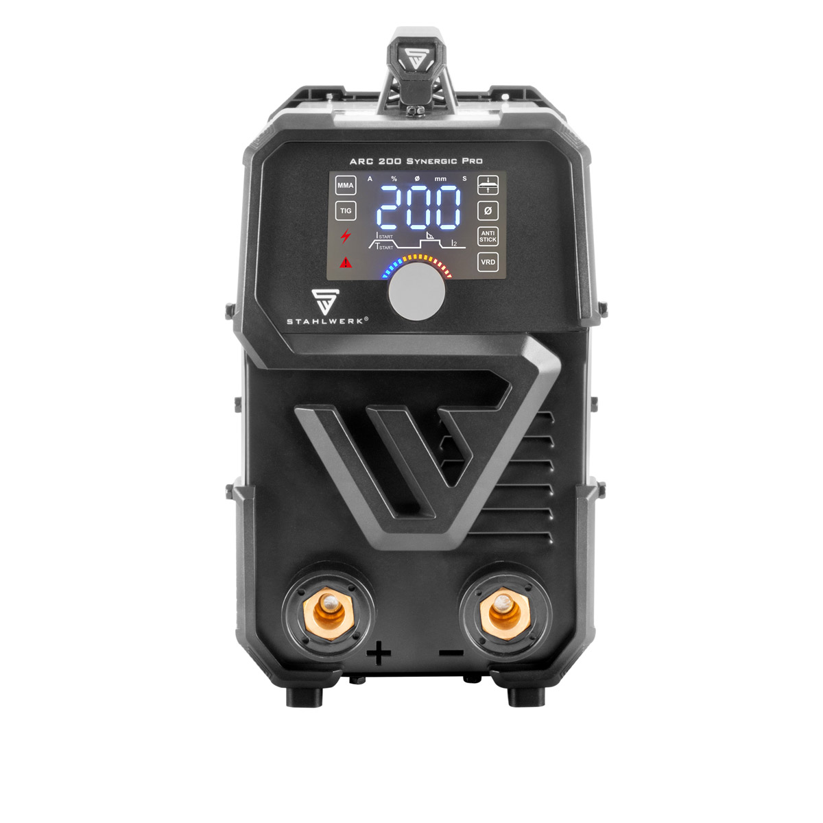 STAHLWERK ARC 200 Synegic Pro je vrlo kompaktan, potpuno sinergijski aparat za elektrolučno zavarivanje s pravih 200 ampera. Prednost ovog laganog aparata za zavarivanje istosmjernom elektrodom je njegov kompaktni dizajn u kombinaciji s visokim performansama. Najnovija generacija napredne IGBT tehnologije omogućuje vrhunske performanse u MMA i DC TIG zavarivanju kontaktnim paljenjem (Lift TIG). ARC 200 Synegic Pro ima brojne podesive funkcije kao što su Hot Start, Arc Force i Anti-Stick, koje sprječavaju izgaranje ili pregrijavanje elektrode, osiguravajući jednostavno zavarivanje i izvrsne rezultate. Pojedinačne postavke su jednostavne za korištenje i intuitivno se podešavaju na LCD zaslonu. Zahvaljujući ručnom prekidaču za uključivanje/isključivanje za VRD (Voltage Reduction Device), izlazni napon ARC 200 Synegic Pro može se smanjiti na sigurnu razinu kako bi se korisnik zaštitio od električnog udara kada se ne zavaruje.