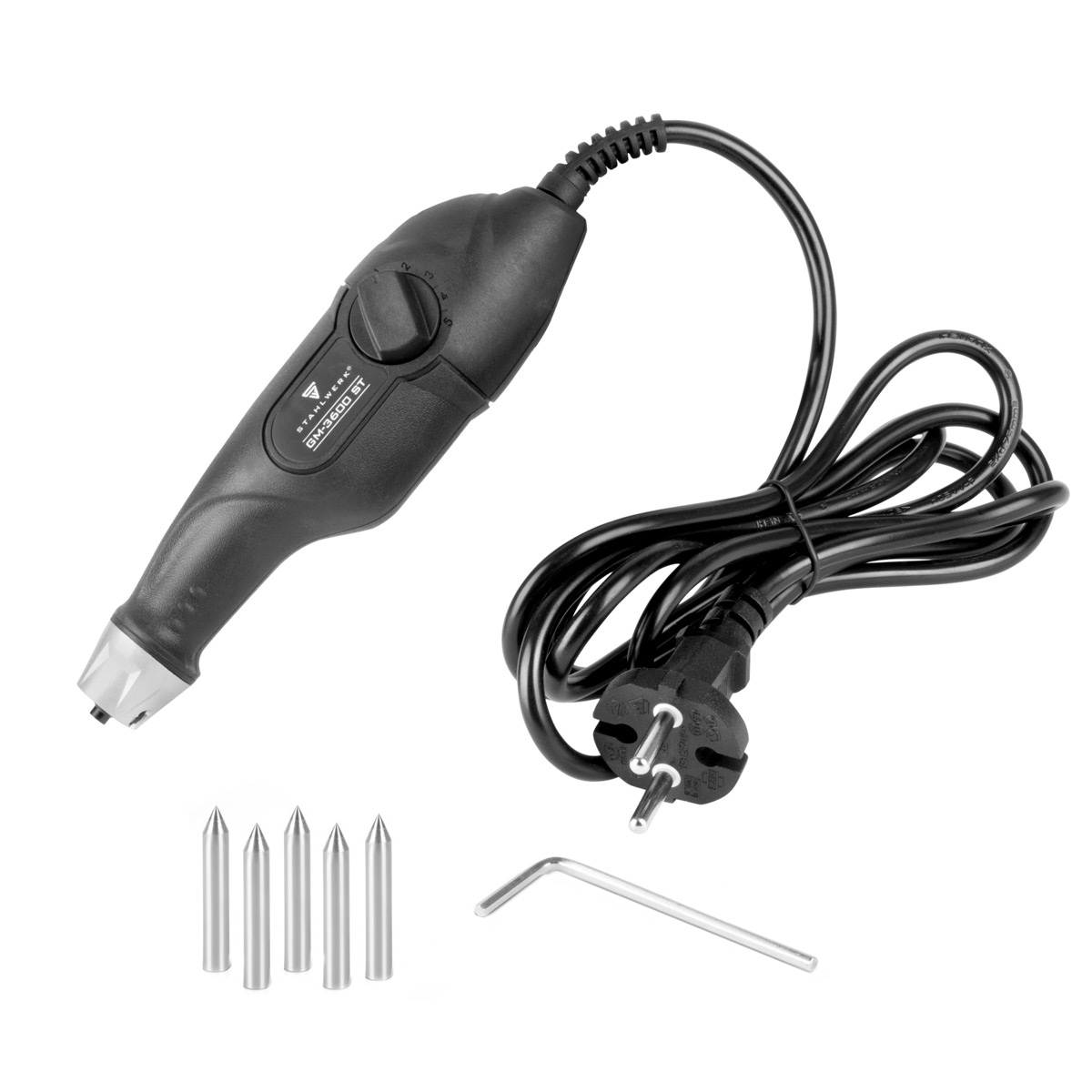Svestrana STAHLWERK gravirna olovka, s motorom od 24 W i 5 postavki dubine hoda pri 3600 udaraca u minuti, idealna je za precizno graviranje. Zahvaljujući podesivoj dubini hoda, alat za graviranje može stvarati i fine i deblje linije. Ovaj električni graver može se koristiti za rad s raznim materijalima, uključujući drvo, plastiku, metal, staklo, keramiku, kamen, kožu i aluminij. Stabilan nosač osigurava sigurno držanje preciznih vrhova. Kompaktni dizajn, mala težina i ergonomsko kućište omogućuju udoban rad, čak i tijekom dulje upotrebe. Ovaj visokokvalitetni stroj za graviranje savršen je za profesionalnu upotrebu u obrtničkim i DIY projektima.