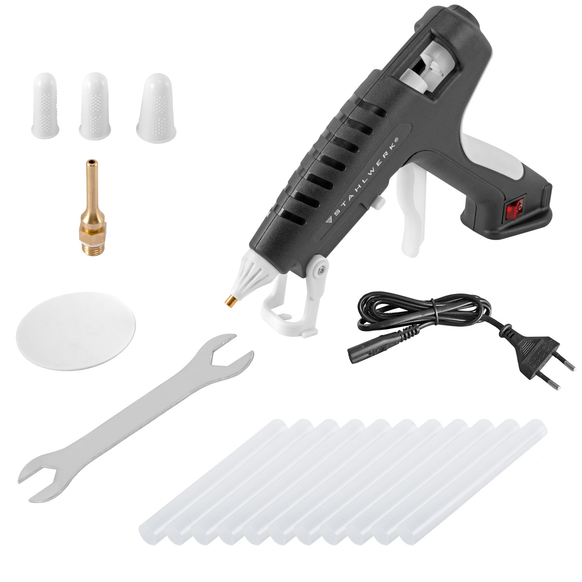 STAHLWERK HKP-250 ST je robusni pištolj za vruće lijepljenje s elektronički kontroliranim grijaćim elementom. Njegov ergonomski dizajn olakšava rukovanje, a mala težina osigurava udoban hvat i optimalnu udobnost pri radu. Visoka snaga od 250 W omogućuje brzo zagrijavanje. Odvojivi kabel za napajanje omogućuje kratka razdoblja bežičnog rada nakon zagrijavanja. Ovaj pištolj za vruće lijepljenje prikladan je za širok raspon materijala, uključujući drvo, kožu, tekstil, pluto, kamen, karton, papir, kao i staklo i metal. Praktični okidač s oprugom i mehanizam za dodavanje osiguravaju precizno doziranje vrućeg ljepila. Pištolj za vruće lijepljenje jamči precizno nanošenje bez kapanja. Uključena je dodatna precizna mesingana mlaznica. Poput unaprijed instalirane mlaznice, ima nepovratni ventil. Obje mlaznice ne kapaju i pokrivaju širok raspon primjena.