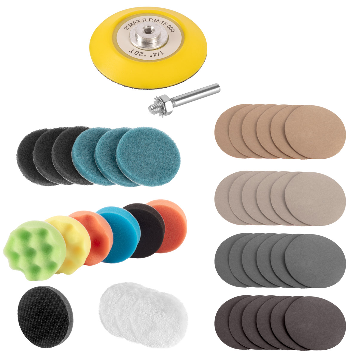 Ovaj praktični set za popravak prednjih svjetala omogućuje učinkovito dubinsko čišćenje zamućenih, izblijedjelih ili mutnih prednjih svjetala. Sveobuhvatni set za restauraciju prednjih svjetala nudi širok izbor jastučića za čišćenje, poliranje, voskiranje i brušenje ogrebotina i oksidacije. Prednja svjetala automobila mogu se lako popraviti u kratkom vremenu. Set za popravak prednjih svjetala univerzalno je primjenjiv i prikladan za sve tipove vozila. Zahvaljujući standardnom držaču bitova od 1/4 inča, jastučići za poliranje i brušenje odgovaraju svim uobičajenim akumulatorskim odvijačima ili bušilicama i spremni su za trenutnu upotrebu. Set za poliranje prednjih svjetala uključuje nastavak za poliranje na kojem se jastučići za brušenje i poliranje mogu lako mijenjati pomoću čičak traka. Visokokvalitetni brusni jastučići s čičak trakom osiguravaju ravnomjernu raspodjelu pritiska i ujednačenu završnu obradu. Različite veličine granulacije jamče precizne rezultate brušenja.