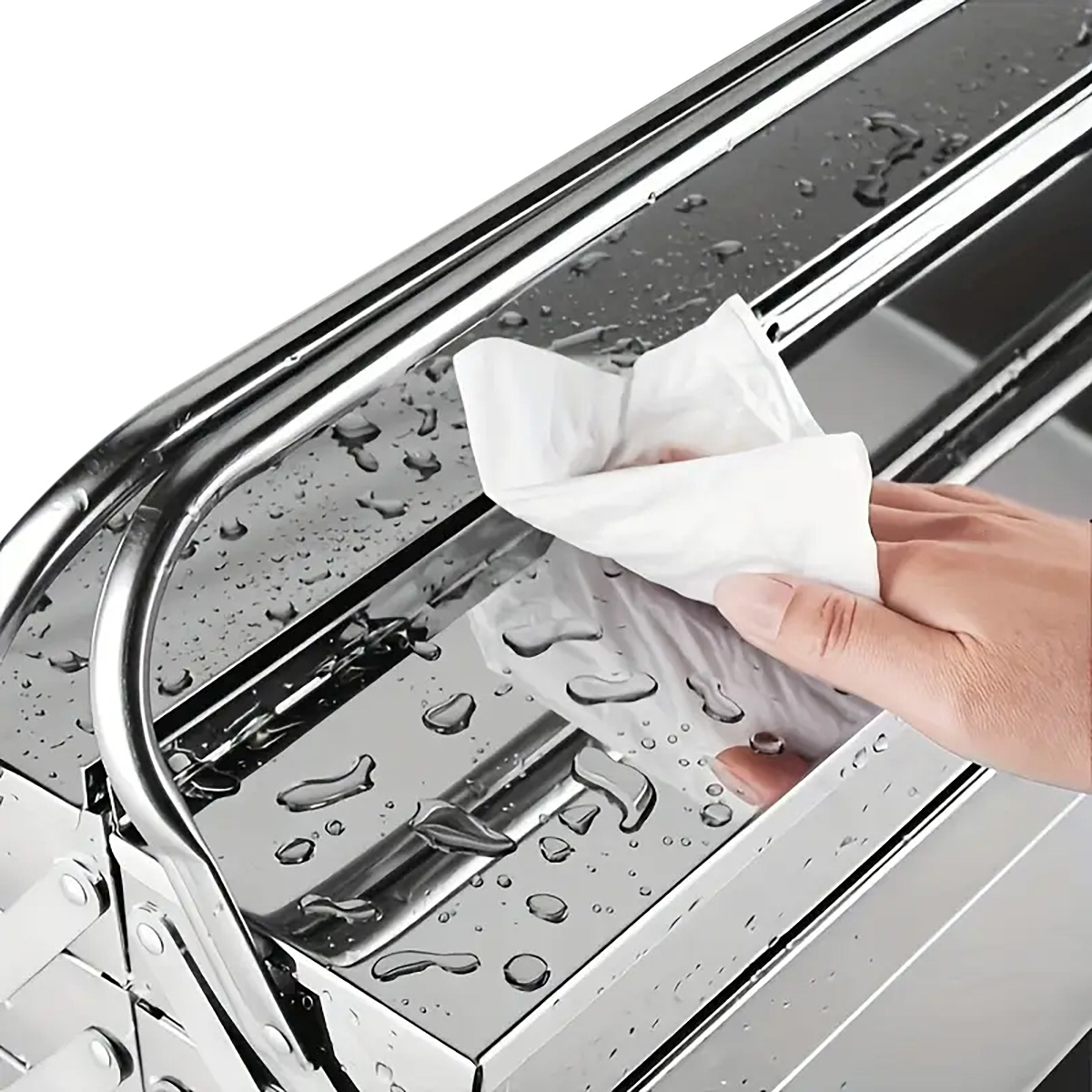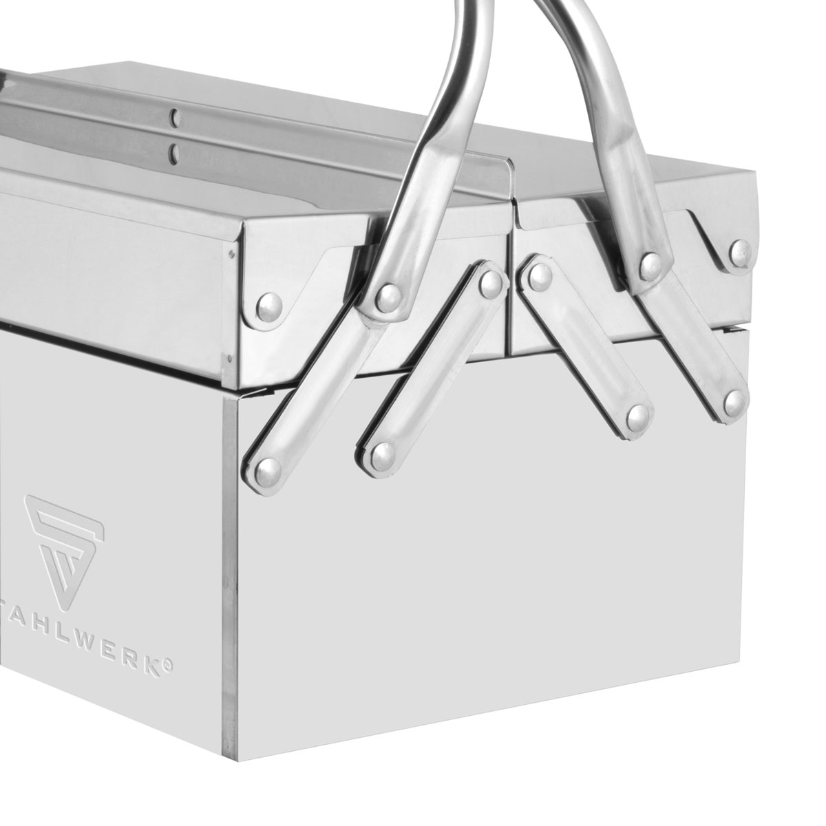 STAHLWERK kutija za alat od nehrđajućeg čelika impresionira svojim jednostavnim dizajnom, praktičnim transportom koji štedi prostor te jednostavnom organizacijom alata. Izrađena od nehrđajućeg nehrđajućeg čelika, ova kutija za alat pouzdan je, izdržljiv i dugotrajan pratitelj na gradilištima ili u kućnim radionicama. Tri pretinca osiguravaju optimalnu organizaciju i urednost za sve vrste alata. Kutija za alat se može proširiti sa strane i sklopiti za kompaktno skladištenje, što olakšava transport. Dvostruka ručka za nošenje automatski zatvara kutiju za alat kada se povuče prema gore, sprječavajući slučajno otvaranje. Kutija za alat se također lako nosi pomoću dvostruke ručke. Zahvaljujući visokokvalitetnoj izradi, ova kutija za alat od nehrđajućeg čelika prikladna je za upotrebu u industriji, trgovini, radionicama, „uradi sam“ projektima i na montažnim trakama.