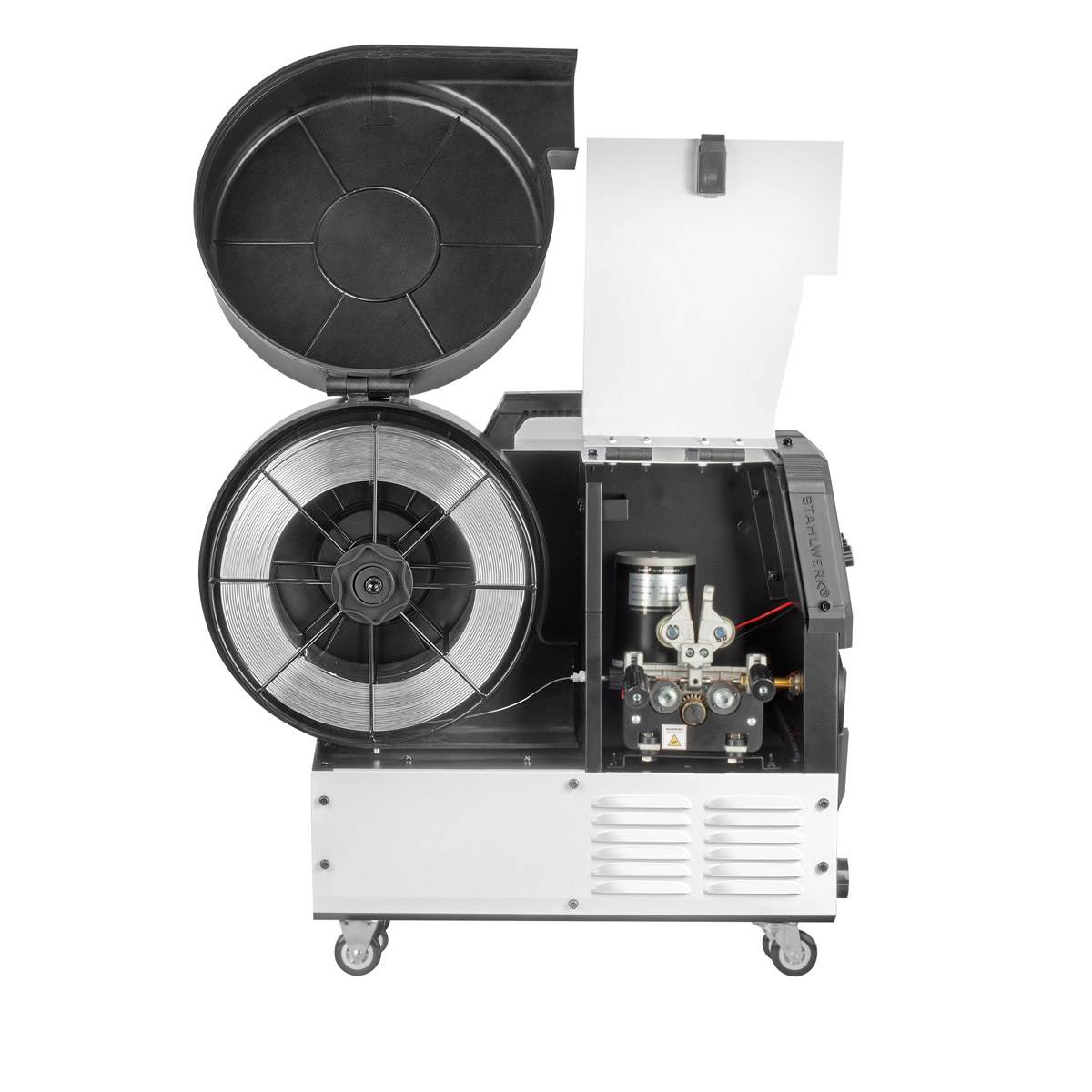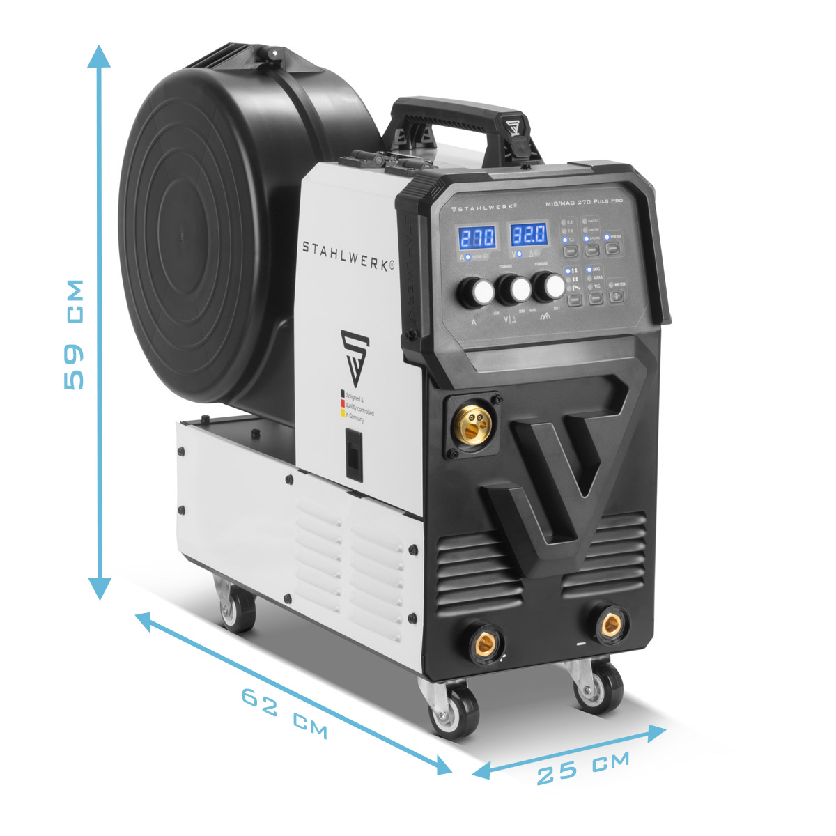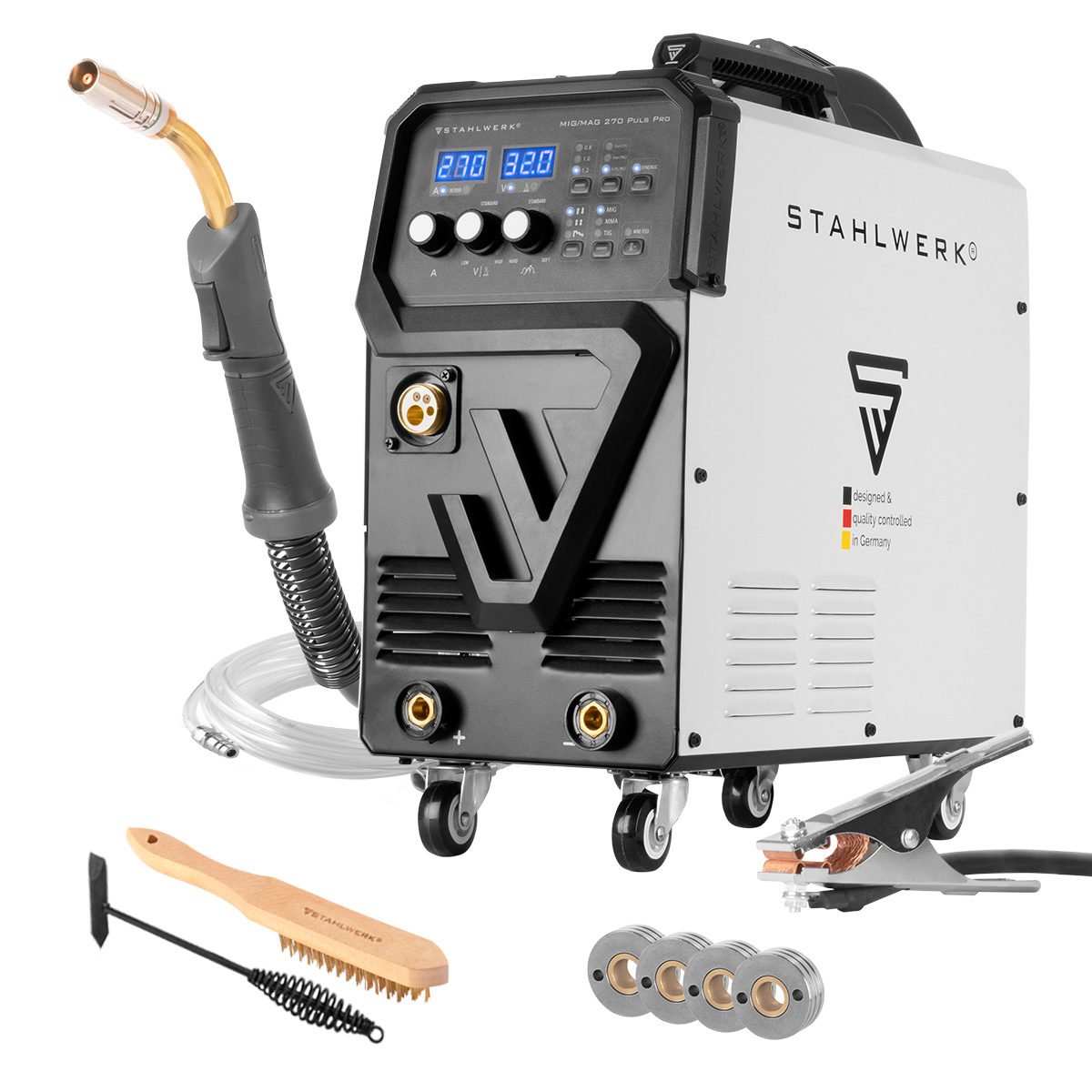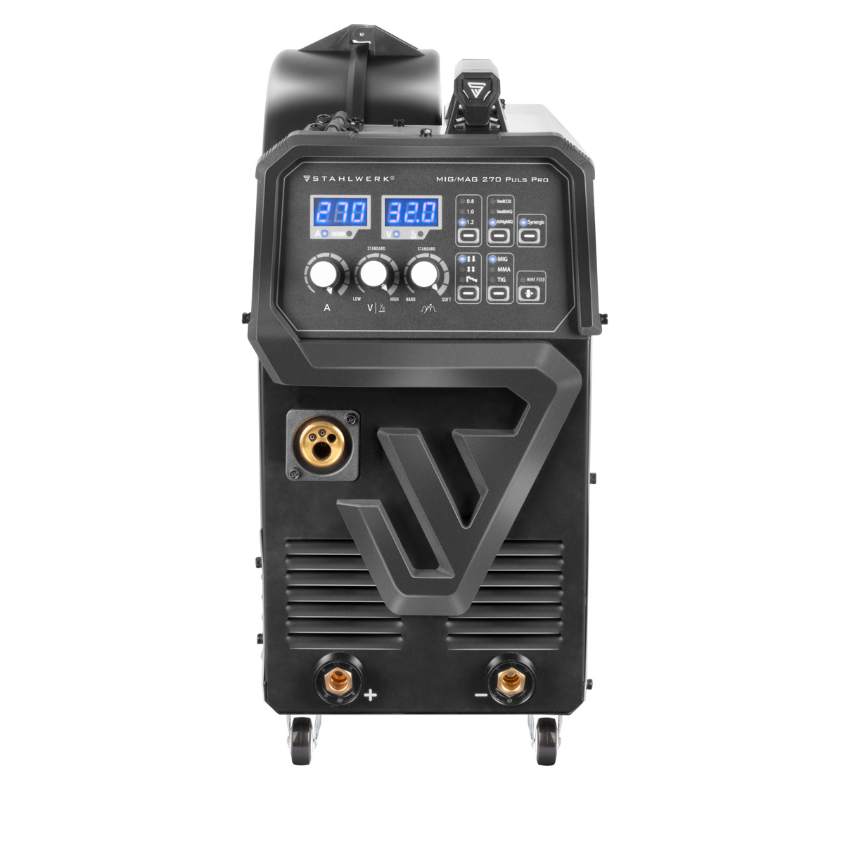 Aparat za zavarivanje STAHLWERK MIG 270 Puls Pro ima sinergijsko dodavanje žice, radi do 270 A i prikladan je za MIG/MAG zavarivanje, kao i Lift TIG i MMA/ARC primjene – omogućujući zavarivanje bez zaštitnog plina. Uređaj nudi brojne parametre zavarivanja i omogućuje precizno zavarivanje tankih limova, metala i nehrđajućeg čelika. Snažan pogon s 4 valjka osigurava pouzdano dodavanje žice, kontinuirano i sigurno transportirajući čak i deblje žice za zavarivanje tijekom MIG/MAG zavarivanja. Uz MIG/MAG i MMA postupke zavarivanja, posebna pulsna funkcija omogućuje čisto i precizno zavarivanje tankih limova optimalnim tempom, što rezultira vidljivo savršenim zavarima. Nadalje, pulsna funkcija omogućuje i zavarivanje aluminija. Parametri zavarivanja lako su čitljivi na preglednom zaslonu. Različiti načini rada mogu se brzo odabrati na upravljačkoj ploči.