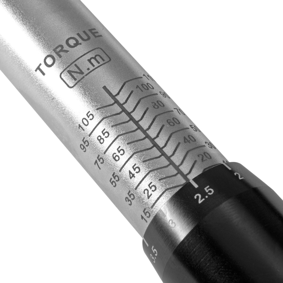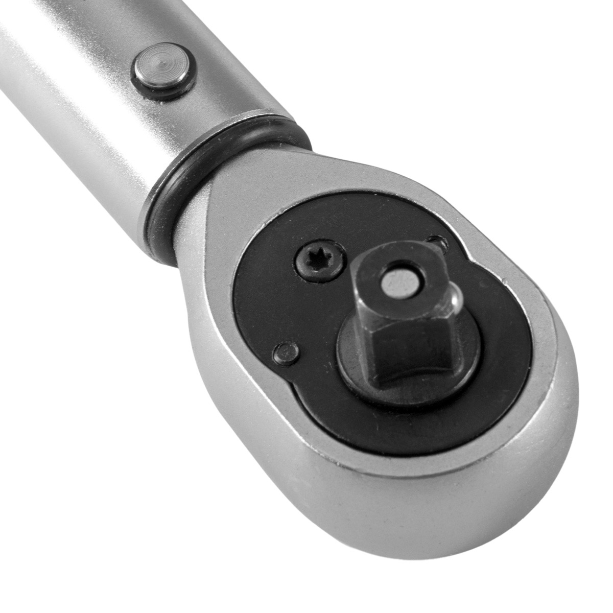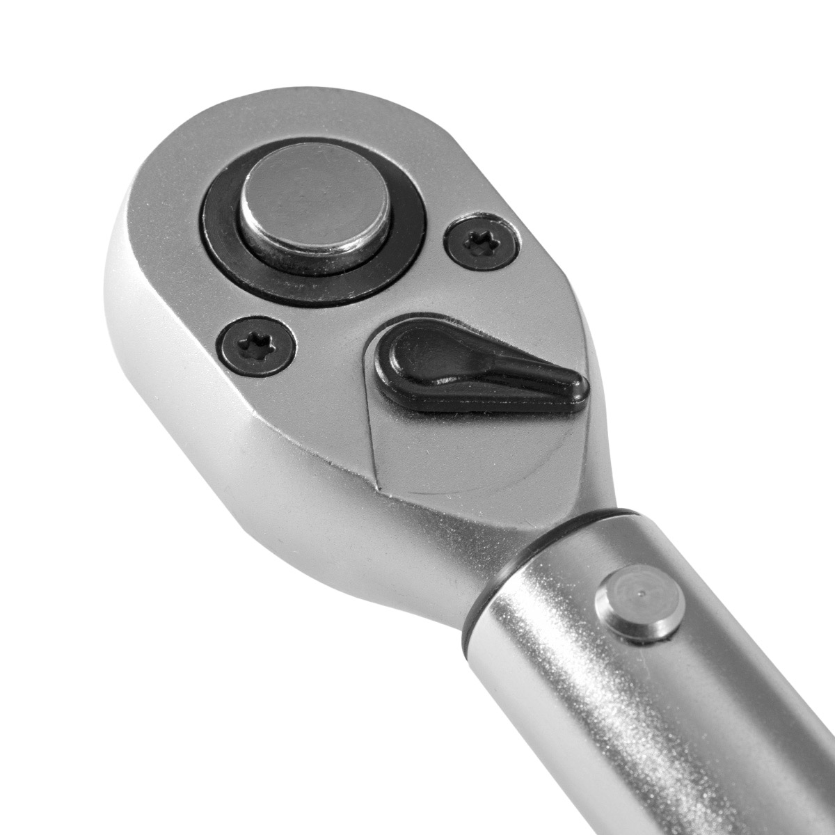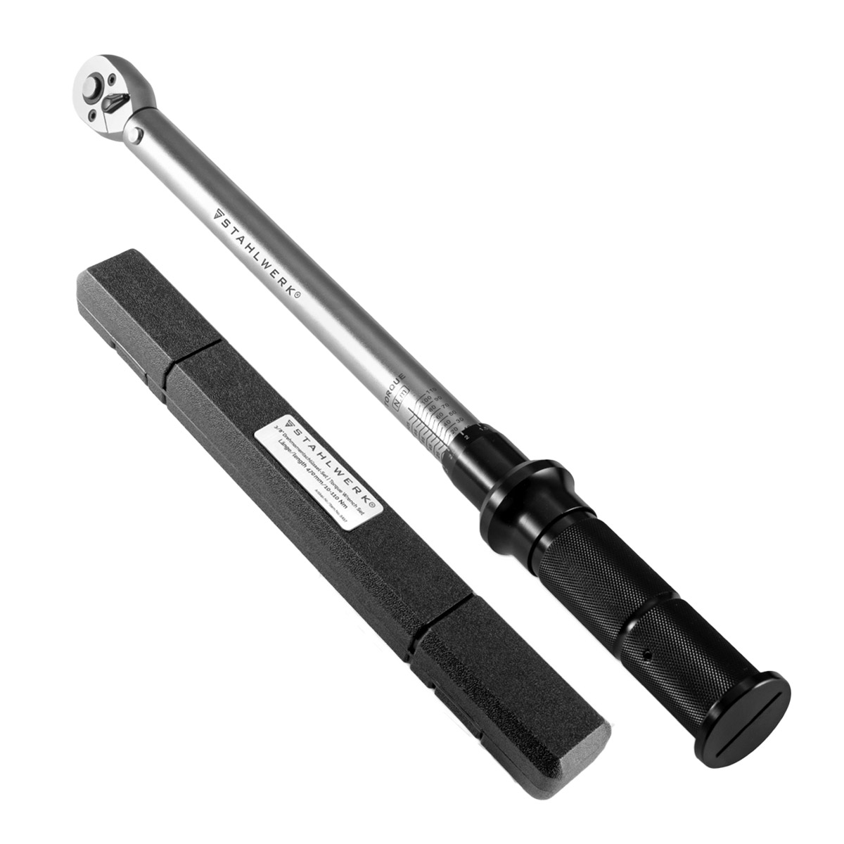S robusnim moment ključem tvrtke STAHLWERK, izrađenim od visokokvalitetnog krom-molibdenskog čelika, možete precizno postaviti željeni moment. Moment ključ radi putem 3/8″ kvadratnog pogona s čegrtaljkom i omogućuje kontrolirano zatezanje stvarnog momenta u rasponu od 10 do 110 Nm. Čujan i taktilni klik aktivira se kada se postigne odabrani moment. Moment se može jednostavno i brzo postaviti i zaključati pomoću skale za očitavanje okretanjem nazubljene aluminijske ručke. Vrtenje u smjeru kazaljke na satu/suprotno od kazaljke na satu praktično se uključuje na glavi čegrtaljke.