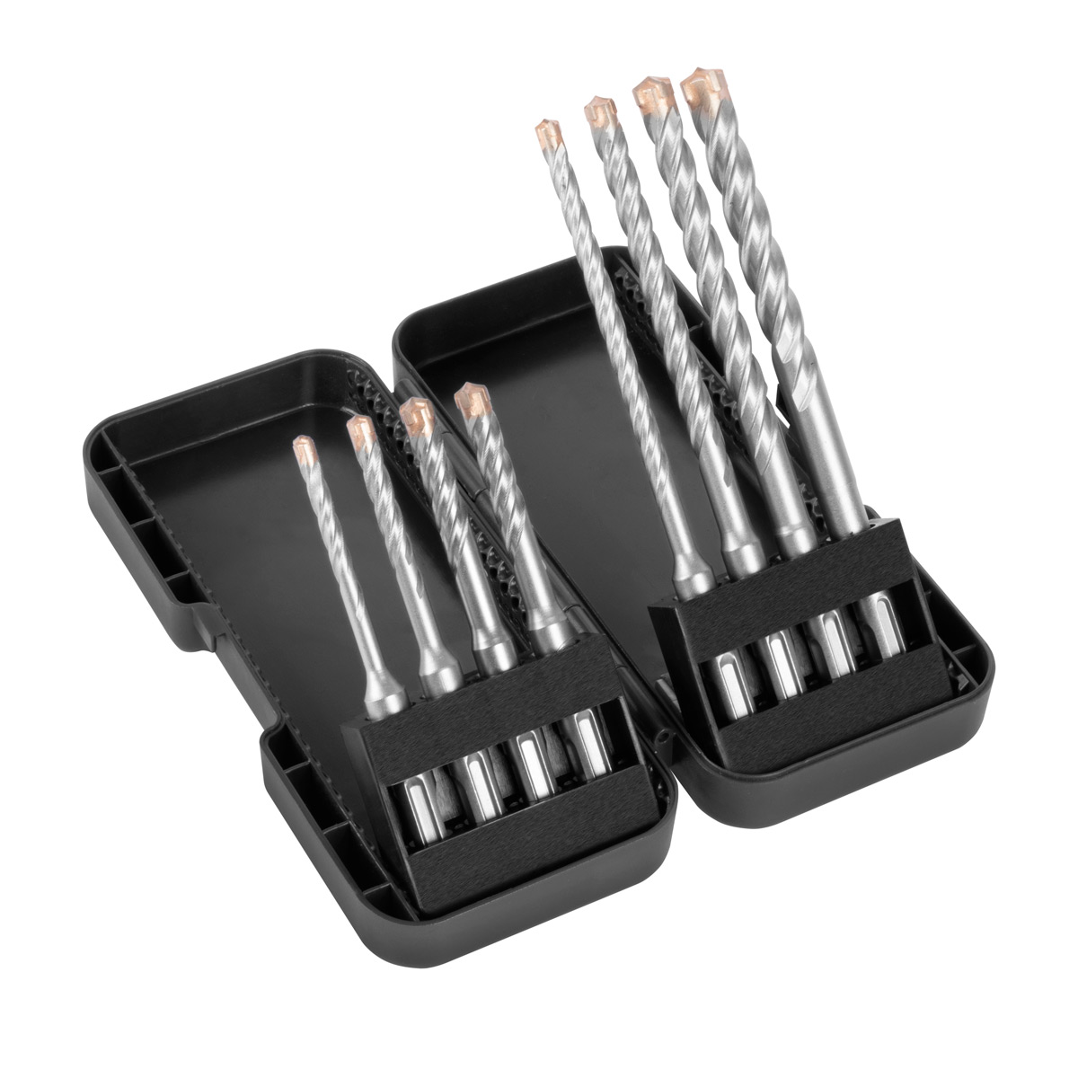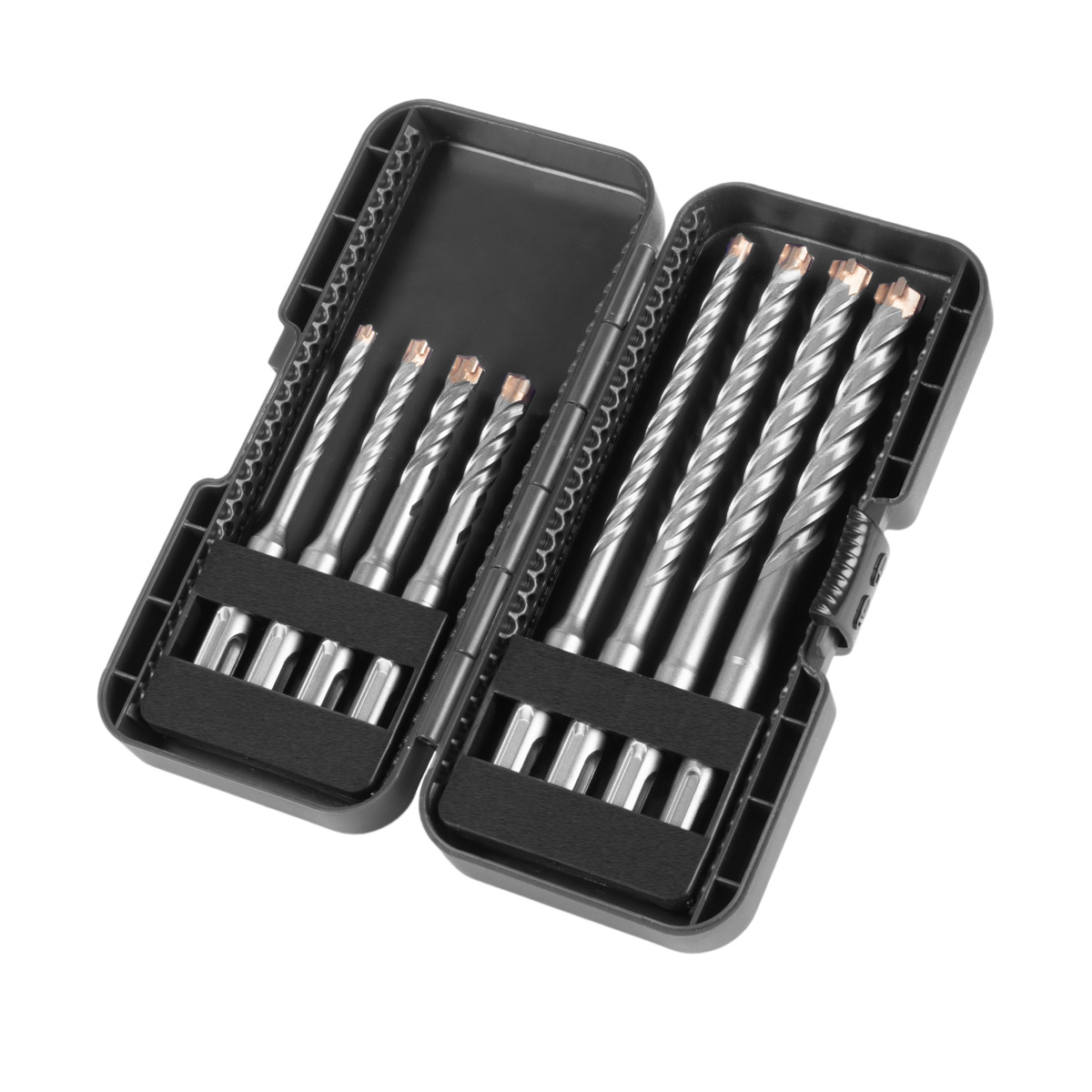 - Set od 8 SDS-Plus svrdla s križnim rezom i dvostrukom spiralom – posebno dizajniran za zahtjevne radove bušenja u betonu, kamenu i zidu. Sadrži četiri SDS svrdla duljine 110 mm (korisna duljina: 40 mm) i još četiri duljine 160 mm (korisna duljina: 90 mm).