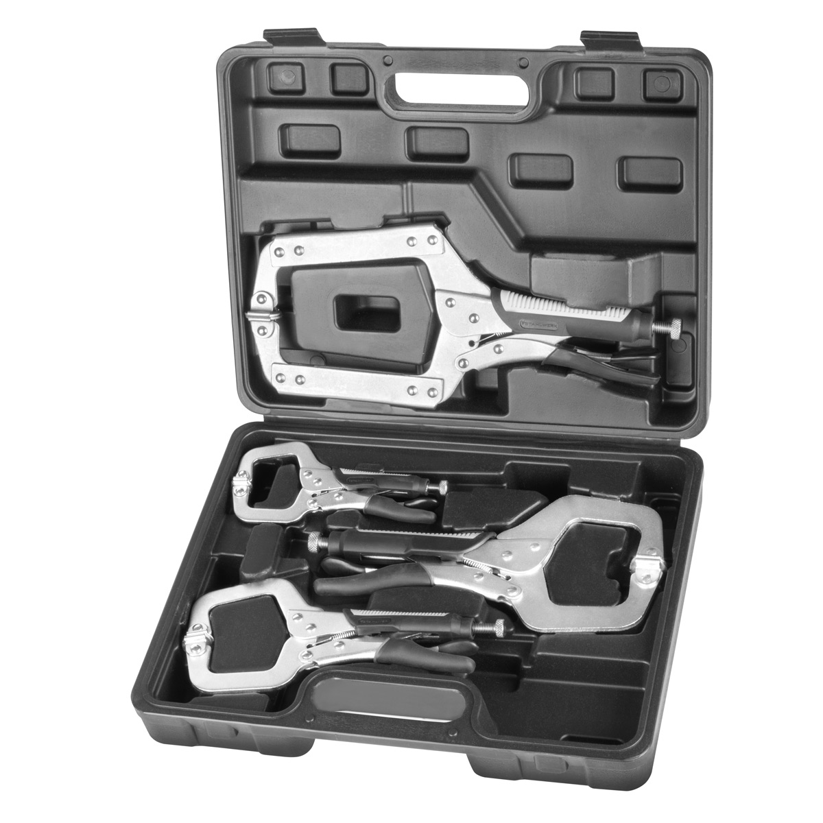 Ovaj set od 4 kliješta za zaključavanje idealan je za širok raspon zadataka u radionici, garaži ili na gradilištu. Uključuje četiri kliješta za zaključavanje u obliku slova C s različitim širinama čeljusti od 6 do 14 inča za sve vrste stezanja i pričvršćivanja. Ova kliješta za zaključavanje posebno su korisna za zavarivanje i rezanje. Sva četiri kliješta imaju vijak za podešavanje za precizno podešavanje potrebnog pritiska stezanja ili podešavanje otvora čeljusti. Ručica za otpuštanje omogućuje trenutno otpuštanje i jednostavno zatvaranje kliješta, što ih čini jednostavnim za korištenje. Dvobojne, ergonomske TPR ručke pružaju siguran, neklizajući hvat i smanjuju umor ruku. Set dolazi u robusnoj torbici za nošenje, što omogućuje organiziran transport i sigurno skladištenje.
