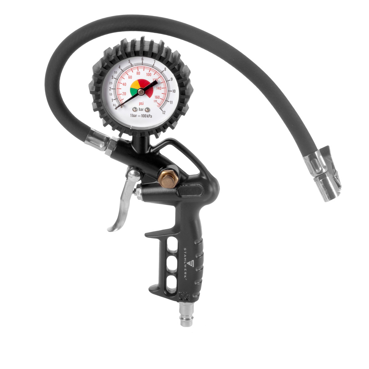 - 5-dijelni STAHLWERK set komprimiranog zraka sastoji se od pištolja za prskanje boje s mlaznicom od 1,5 mm, uključujući posudu za gravitacijski dovod, pištolja za puhanje, pištolja za čišćenje sa spremnikom tekućine, pumpe za napuhavanje guma s manometrom i 5-metarskog spiralnog crijeva promjera 8 mm.