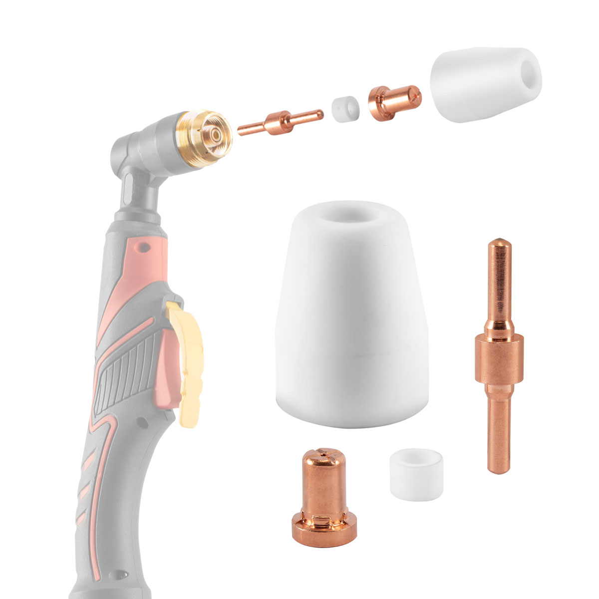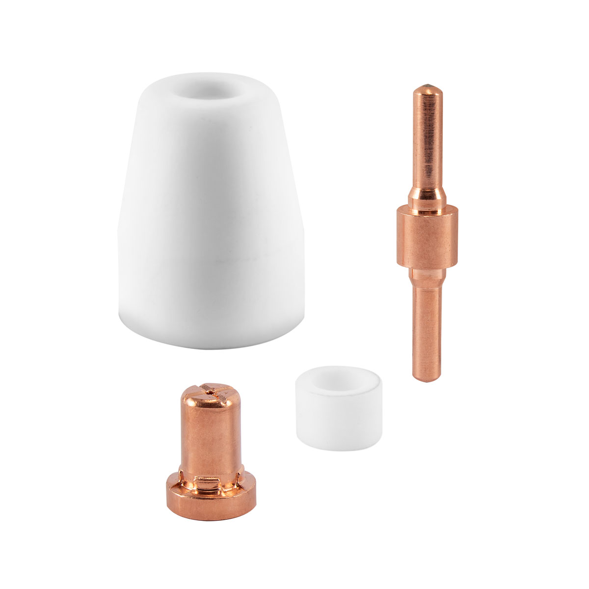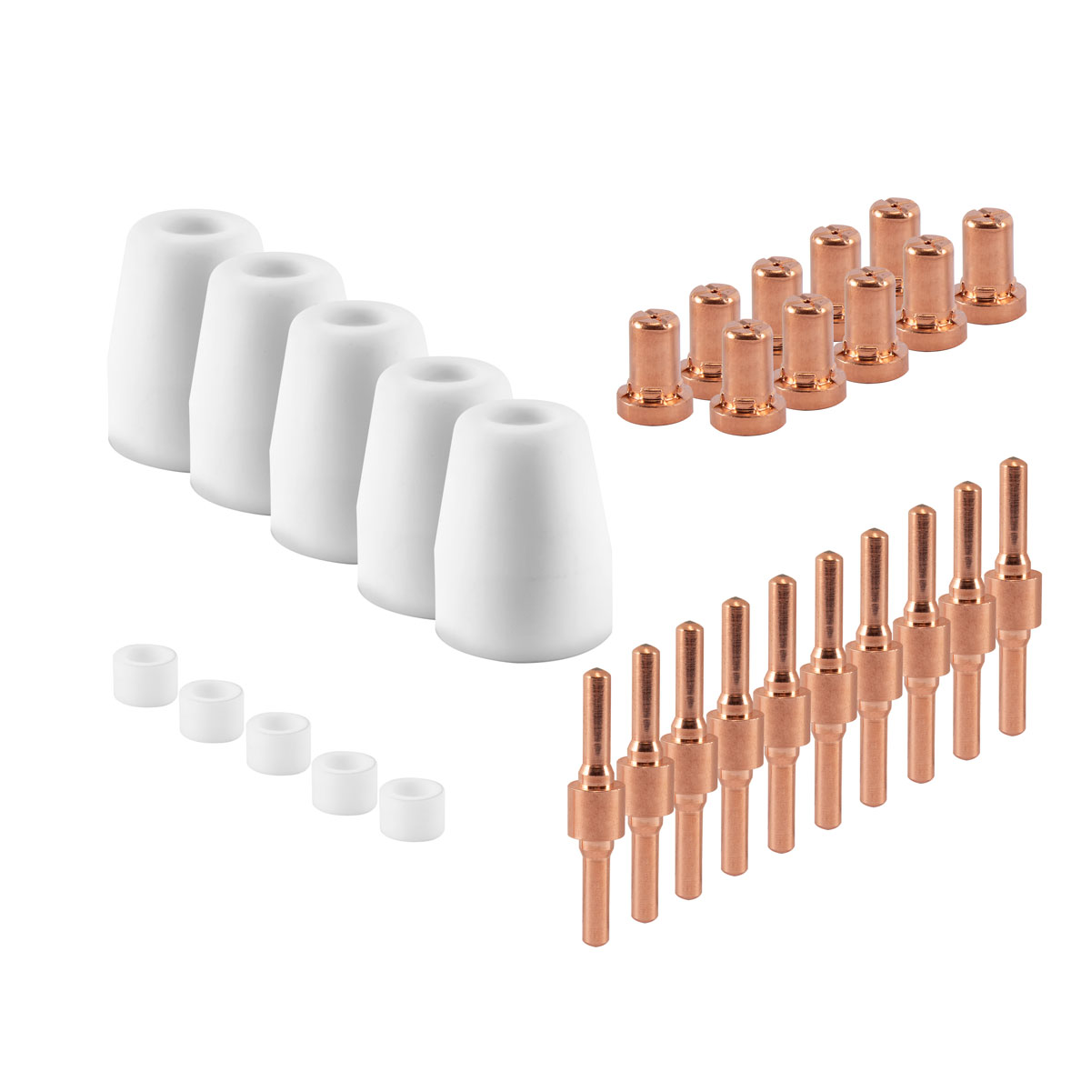 Set od 30 dijelova: 10 x plazma mlaznica, 10 x elektroda, 5 x vrtložnih prstenova, 5 x keramičkih kapica. Pogodno za sve PT-31 plazma plamenike, uključujući i one drugih proizvođača.