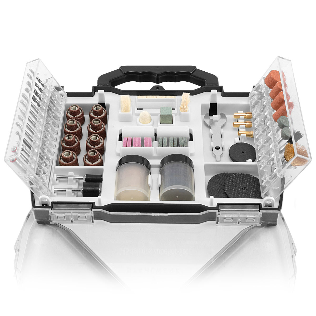 Diskovi za poliranje/brušenje: 1 x filcani disk za poliranje 25 mm, 4 x filcani diskovi za poliranje 12,4 mm, 1 x jastučić za poliranje 25 mm, 1 x glava za poliranje 10 mm, gruba 6 x 19,7 mm brusni diskovi, 6 x 19,7 mm finih brusnih diskova, 36 x 0,7 mm reznih diskova promjera 24,3 mm, 40 x brusnih diskova promjera 19 mm