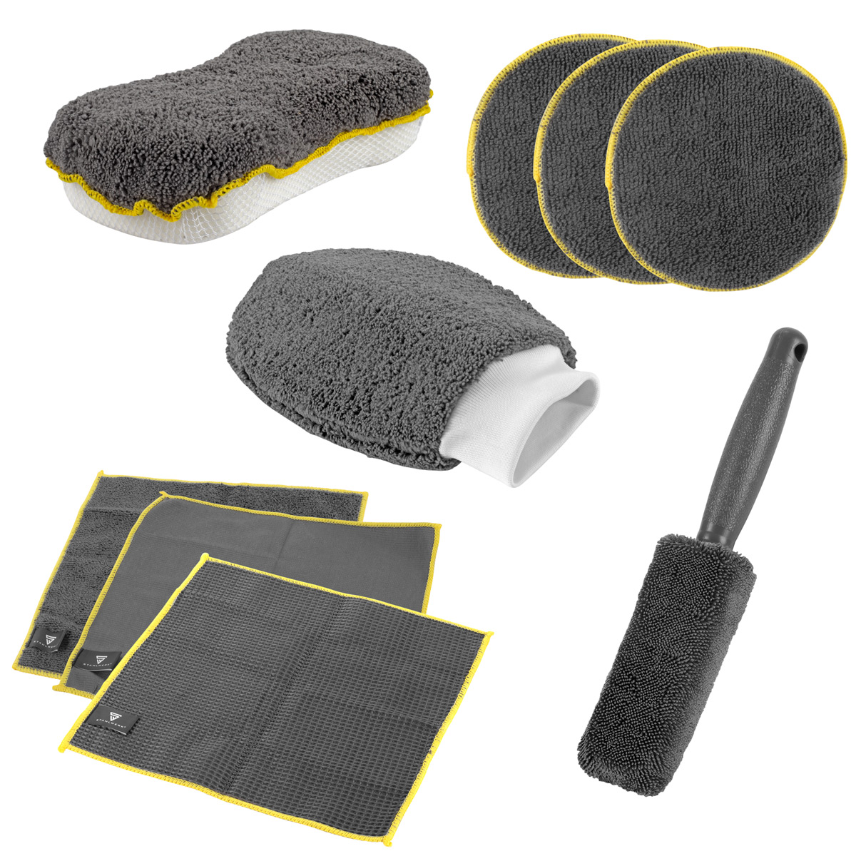 Ovaj praktični set za detaljno čišćenje sastoji se od tri visokokvalitetne krpe od mikrovlakana, spužve od mikrovlakana, rukavice za pranje automobila, četke za detaljno čišćenje kotača i tri aplikatora, što ga čini idealnim za profesionalno čišćenje, sušenje i poliranje. Set za čišćenje automobila posebno je koristan za njegu automobila i detaljne radove pri pripremi vozila. Pouzdano uklanja prljavštinu, prašinu i ostatke blata, čak i tvrdokorne naslage. Krpe, četka, spužva, rukavica za pranje i aplikatori nježni su prema osjetljivim područjima poput laka, kotača i nadzornih ploča, sprječavajući mikroogrebotine. Ovaj svestrani set za njegu automobila izuzetno je upijajući, periv u perilici rublja, izdržljiv je i brzo se suši. Zahvaljujući visokokvalitetnoj izradi, ovi univerzalno primjenjivi proizvodi za čišćenje automobila nude izvrsne performanse čišćenja, visoku izdržljivost i iznimno dug vijek trajanja.