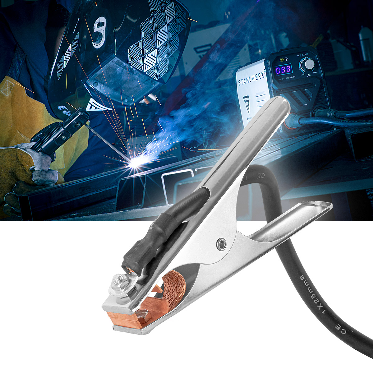 - STAHLWERK 3-metarski kabel za uzemljenje za zavarivanje dizajniran je za maksimalno opterećenje od 300 ampera i dolazi potpuno sastavljen s utikačem i stezaljkom za uzemljenje.