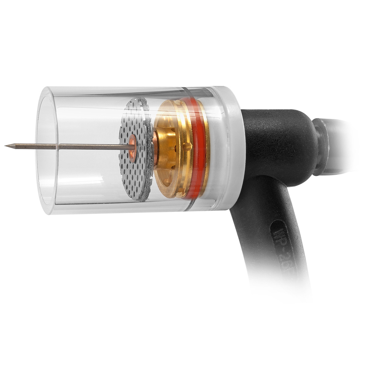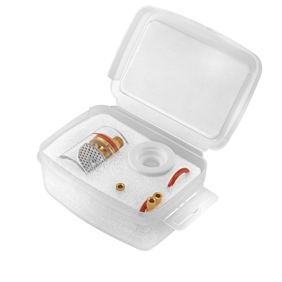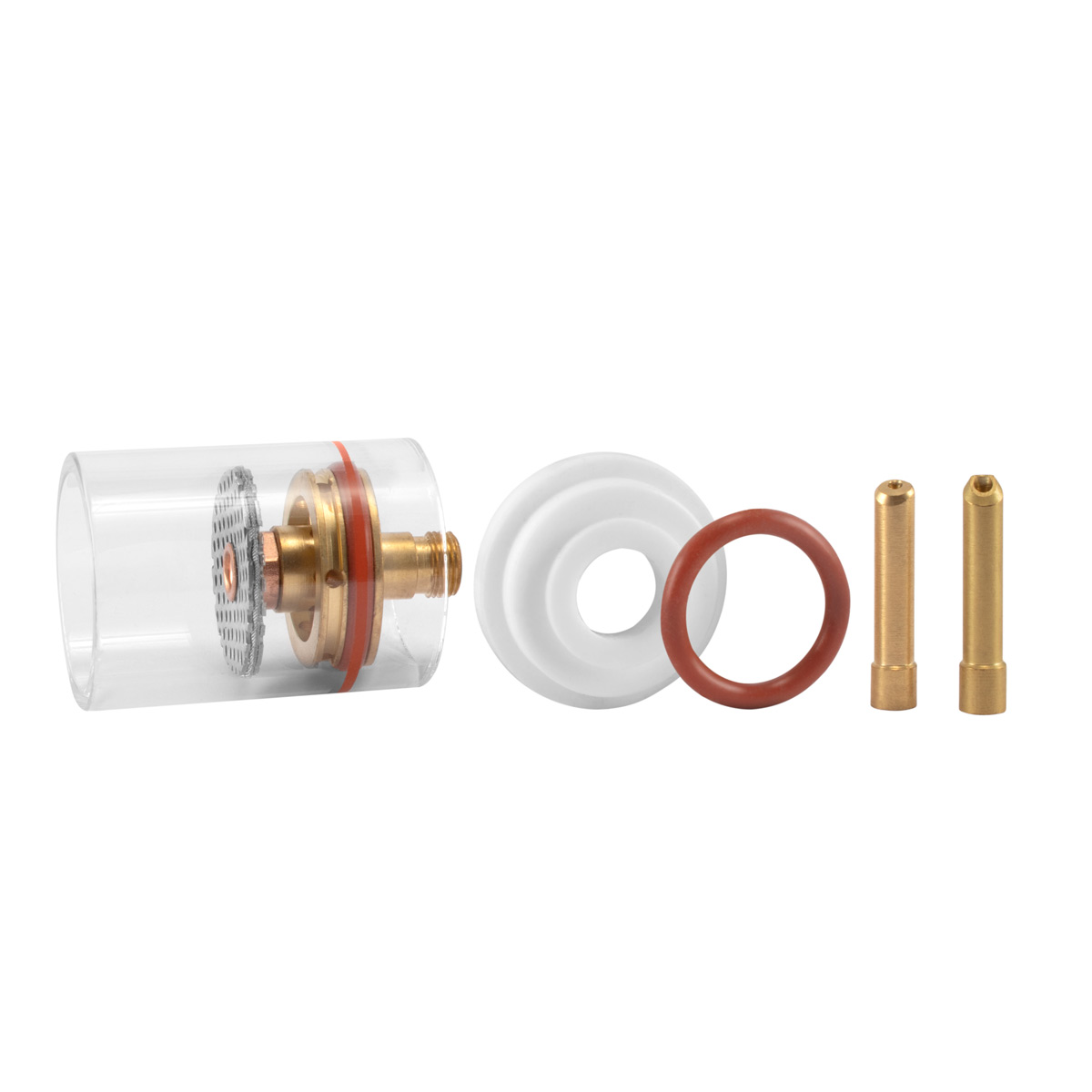 Visokokvalitetni set od 7 staklenih plinskih leća STAHLWERK TIG osigurava optimalnu vidljivost zavarivačke kupke tijekom procesa zavarivanja. Savršeno usklađen s originalnim STAHLWERK TIG plamenicima. Set pribora za zavarivanje sastoji se od jumbo staklene plinske mlaznice (unutarnji promjer 29 mm, duljina 47 mm), stezne čahure 2,4 mm, stezne čahure 1,6 mm, difuzora/zaslona za plin, steznog elementa, silikonske brtve i izolatora. Visokokvalitetni pribor za zavarivanje za vaše projekte zavarivanja. Staklena mlaznica otporna na toplinu za optimalnu vidljivost zavarivačke kupke tijekom procesa zavarivanja. Smanjena potrošnja plina i turbulencija, dulji vijek trajanja volframove elektrode i svjetliji zavareni šavovi zahvaljujući plinskim lećama. Izvrsna svojstva paljenja za TIG zavarivanje. Povećane performanse i pouzdanost vašeg plamenika zahvaljujući vrhunskim potrošnim dijelovima. Posebno dizajniran za sve WP-26 plamenike. Također kompatibilan s WP-17/WP-18/WP-27.