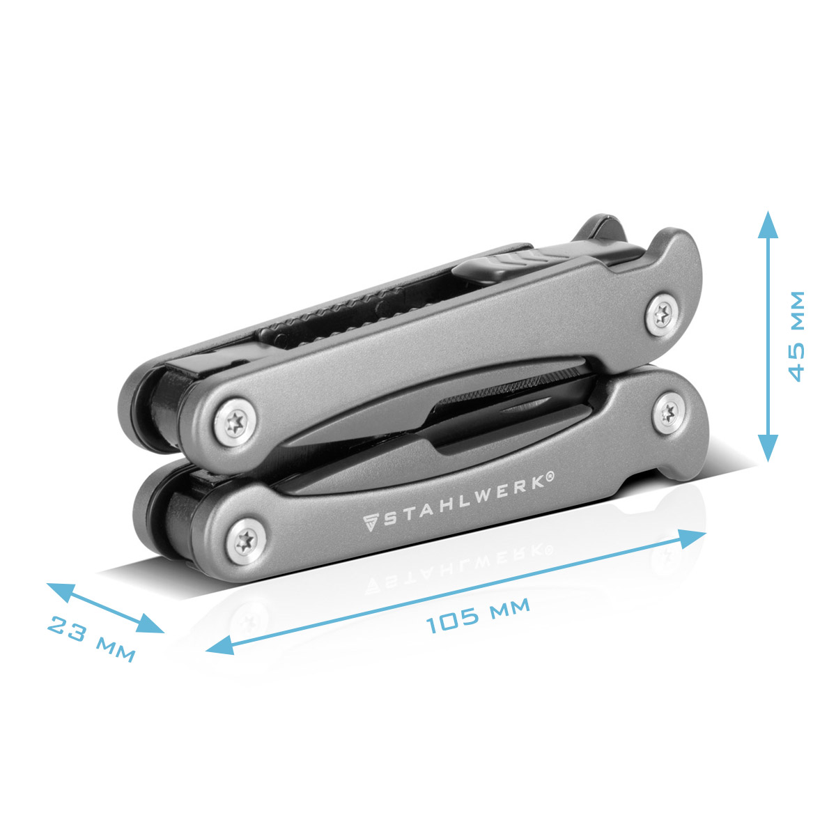 Sa svojih 13 alata, STAHLWERK multitool vas oprema za svaku situaciju. Ovaj svestrani džepni nož idealan je za rezanje, piljenje, turpijanje, uvrtanje vijaka i još mnogo toga. Multitool uključuje razne svakodnevne alate kao što su nož, pila, turpija, kombinirana kliješta, rezači žice, odvijači s prorezom (veliki, srednji i mali), križni odvijač, otvarač za konzerve, otvarač za boce, kuka/kandža za čavle te otvarač za pakete i pisma. Različiti alati ovog robusnog multitoola izrađeni su od kaljenog nehrđajućeg čelika otpornog na hrđu, a kućište je izrađeno od visokokvalitetnog aluminija. Sklopivi nož udobno leži u ruci, a ergonomska ručka s ugodnim osjećajem osigurava sigurno rukovanje. Integrirana sigurnosna brava pruža dodatnu zaštitu. Multitool dolazi u visokokvalitetnoj poklon kutiji.