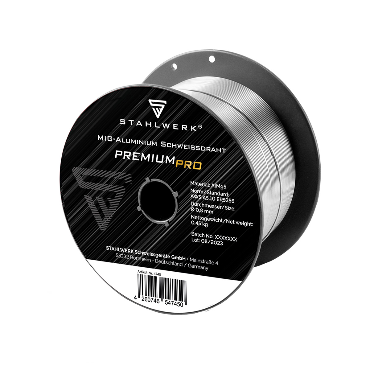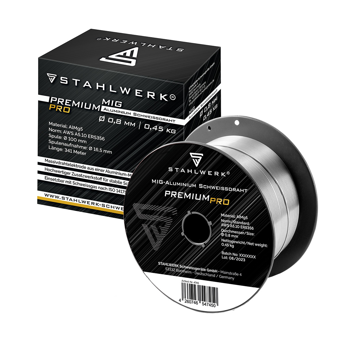 Univerzalno primjenjiva MIG/MAG žica za zavarivanje aluminija ER5356 (AlMg5) promjera 0,8 mm na kolutu žice od 0,45 kg. Ovaj visokokvalitetni MIG/MAG dodatni materijal prikladan je za gotovo sve MIG/MAG aparate za zavarivanje dizajnirane za zavarivanje aluminija. Kompaktni kolut žice za zavarivanje ima trn od 16 mm. Zbog visoke kemijske čistoće, puna žičana elektroda proizvodi vrlo malo prskanja, što osigurava izvrsne rezultate zavarivanja i stabilne zavare. Ova žičana elektroda prikladna je za zavarivanje aluminija zaštitnim plinovima kao što su argon 4.6, argon 4.8 i smjese plinova (vidi DIN EN ISO 14175 (I1 I2 I3)). Ova univerzalna žica za zavarivanje idealna je za profesionalnu upotrebu u industriji, obrtu i „uradi sam“ projektima.