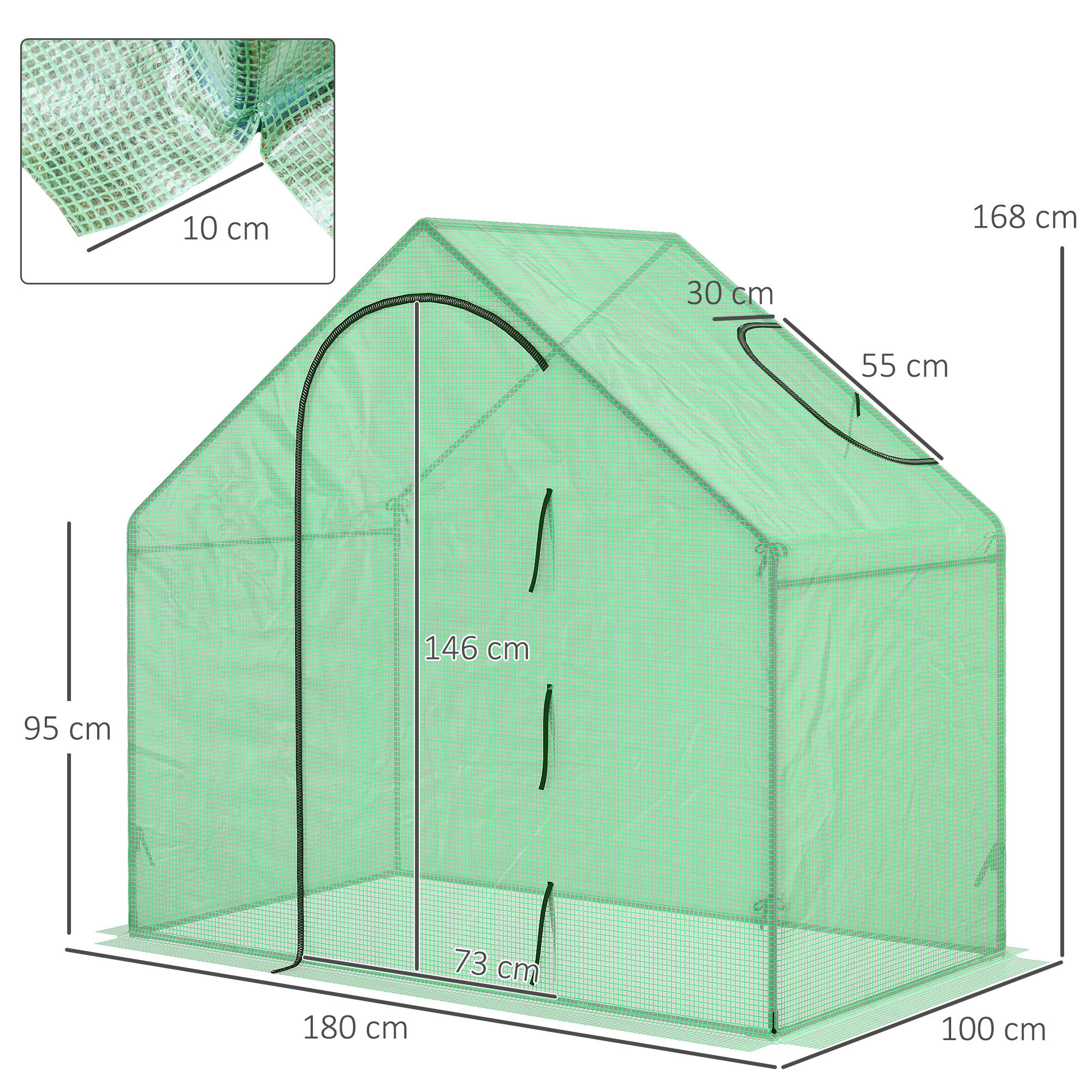 Naš staklenik [BRAND NAME] savršen je izbor za one koji vole vrtlarenje. Staklenik vašim biljkama daje prednost u rastu i pomaže im da prežive teške uvjete različitih godišnjih doba. Smanjite rizik od gubitka biljaka nakon preseljenja u vanjsko okruženje. Opis: ✔ Pogodno za biljke, povrće, voće i cvijeće ✔ Izrađeno s čeličnim okvirom i PE pokrovom za dugotrajnu upotrebu ✔ Duljina 1,8 m i širina 1 m pružaju kompaktan prostor za uzgoj povrća i biljaka ✔ Čelični okvir nudi čvrstu i otpornu na koroziju strukturu ✔ Rub pokrova od 10 cm može se zakopati u zemlju za dodatnu stabilnost Specifikacije: ✔ Boja: Zelena ✔ Materijal: Čelik, PE plastika ✔ Dimenzije proizvoda: 180D x 100Š x 168V cm ✔ Veličina prozora: 55Š x 30V cm