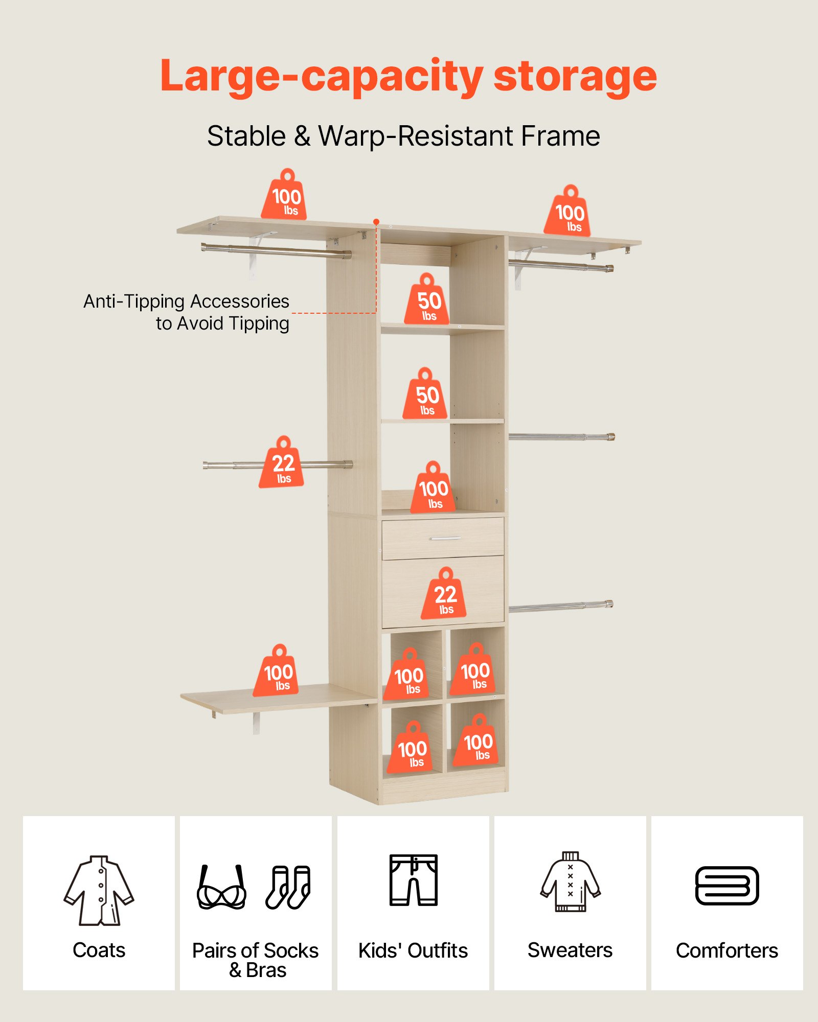 VEVOR stalak za odjeću s 2 ladice, podesivi drveni stalak za odjeću, organizator za ormar s 5 izvlačnih šipki za odjeću (46-81 cm) za ugradbene ormare
