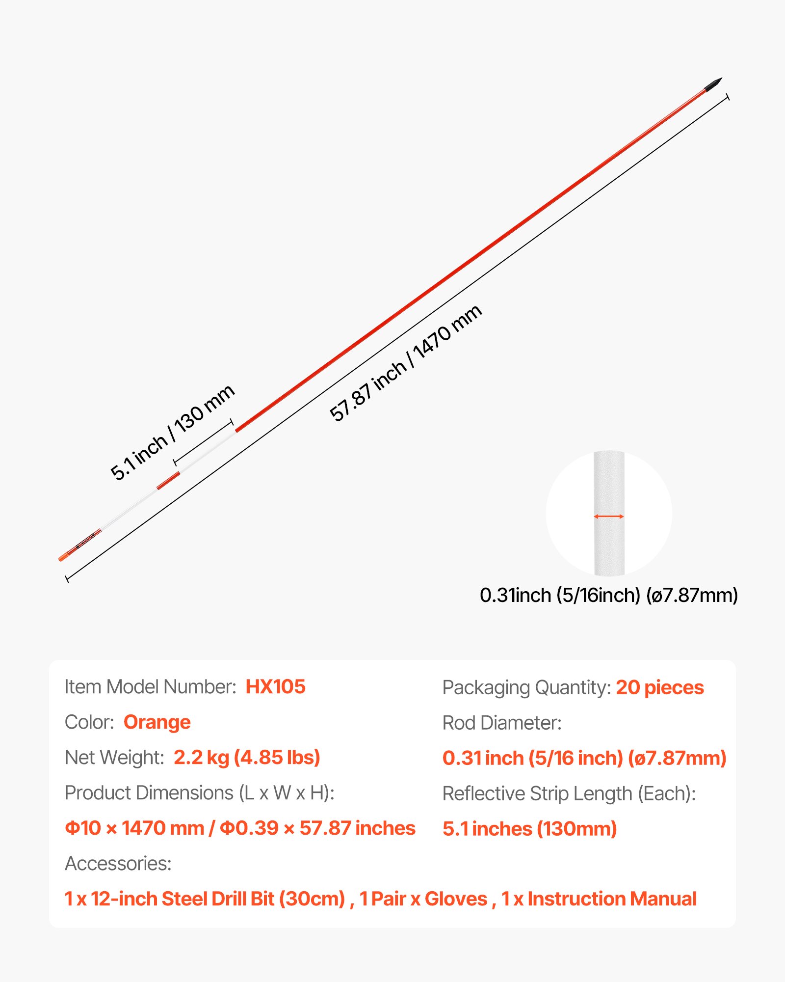 Broj reflektirajućih traka: 2 segmenta, Unutarnja struktura štapa: Šuplja, Neto težina: 2,2 kg (4,85 lbs), Materijal kapice štapa: PE, Promjer štapa: 0,31 in (5/16 in) (ø7,87 mm), Dimenzije proizvoda (D x Š x V): Φ10 x 1470 mm / Φ0,39 x 57,87 in, Veličina suženog vrha: Φ10 x 40 mm / Φ0,39 x 1,57 inča, Materijal reflektirajuće trake: Akril, Kapica uključena: Da (uključujući svrdlo i rukavice), Veličina šipke: Φ7,87 x 1470 mm / Φ0,31 x 57,87 inča, Boja: Narančasta, Broj modela artikla: HX105, Veličina svrdla: Φ8 x 300 mm / Φ0,31 x 11,81 inča, Duljina reflektirajuće trake (svaka): 5,1 inča (130 mm), Širina reflektirajuće trake: 130 mm / 5,12 inča, Veličina kapice šipke: Φ10 x 20 mm / Φ0,39 x 0,79 inča, Materijal šipke: Stakloplastika bez alkalija + nezasićena smola, Količina pakiranja: 20 komada, Materijal konusnog vrha: PE, Materijal svrdla: Vrh od legiranog čelika, Tijelo od kromiranog čelika