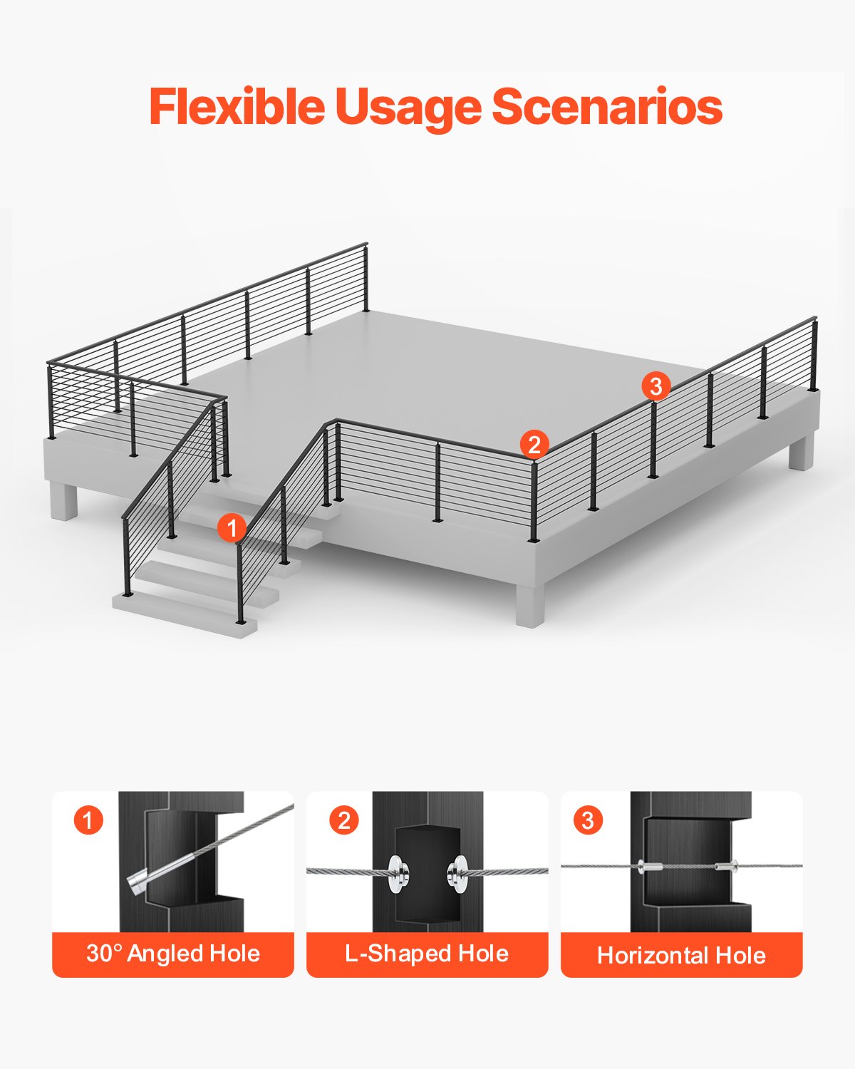 VEVOR Stup za ogradu od kabela, 914×50,8×50,8 mm, Stup za ogradu za stepenice od kabela, prethodno izbušene horizontalne rupe, nehrđajući čelik SUS304, za rukohvat, balustradu, crna, 1JZLGZXHS9148RVYS001V0