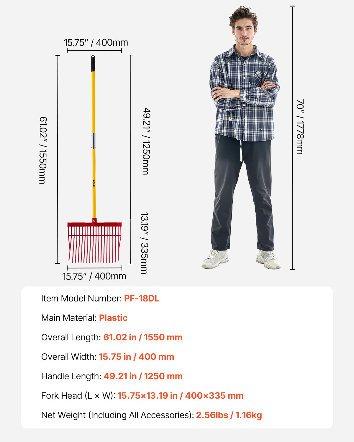VEVOR Švedske vile za gnoj, 18 zubaca, Vile za gnoj s dugom drškom od stakloplastike, Plastične vile za sijeno 1550 mm, Alat za vile za gnoj za vrtlarstvo, štalu za konje, staju, travu, čišćenje sijena, poljoprivredne radove