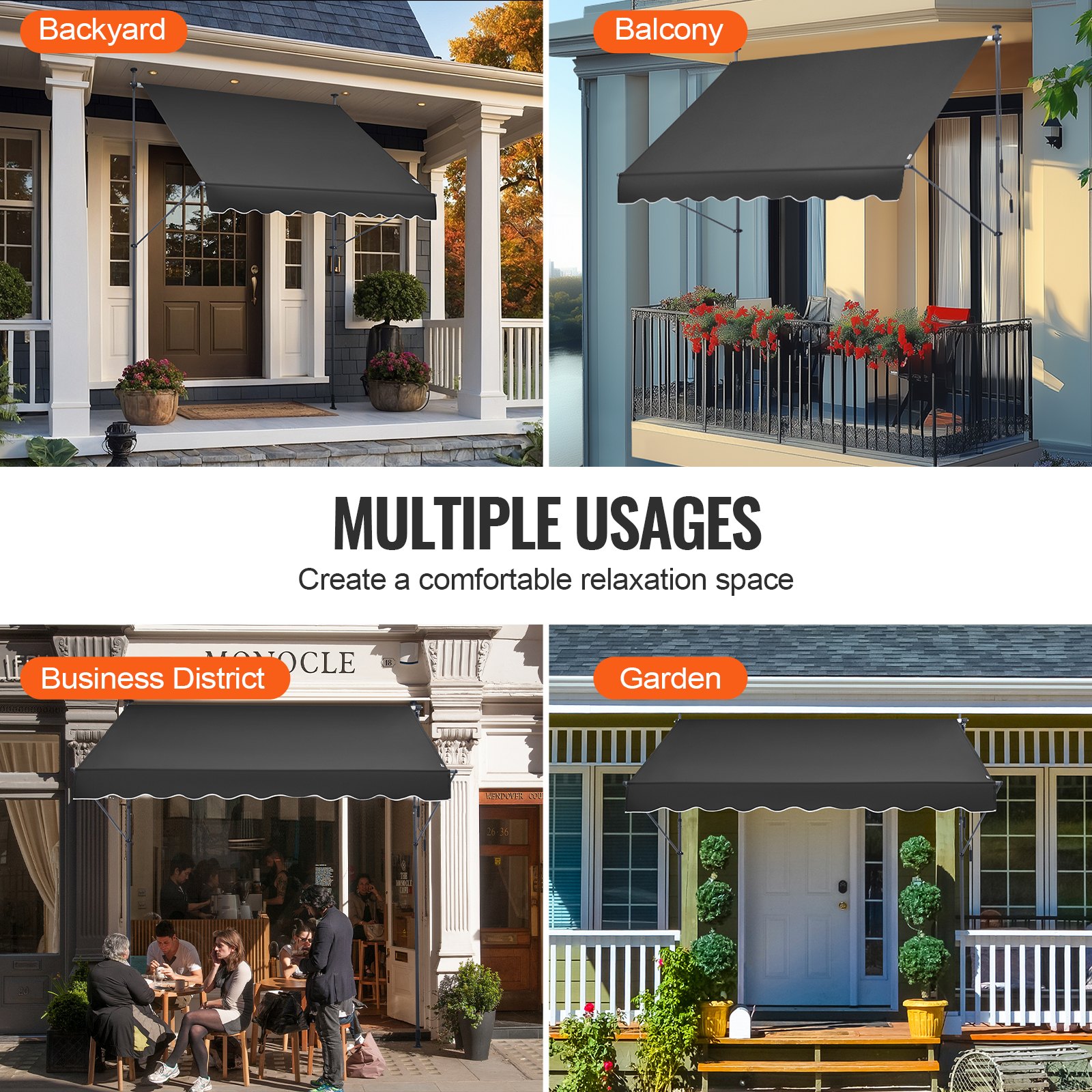 VEVOR Tenda sa stezaljkom 250 x 120 cm, Tenda za balkon s ručnom ručicom, Tenda za sunce, Natkrivena tenda za terasu, Podesiva visina od 218 do 309 cm, Tenda za terasu/balkon/vrt, Crna