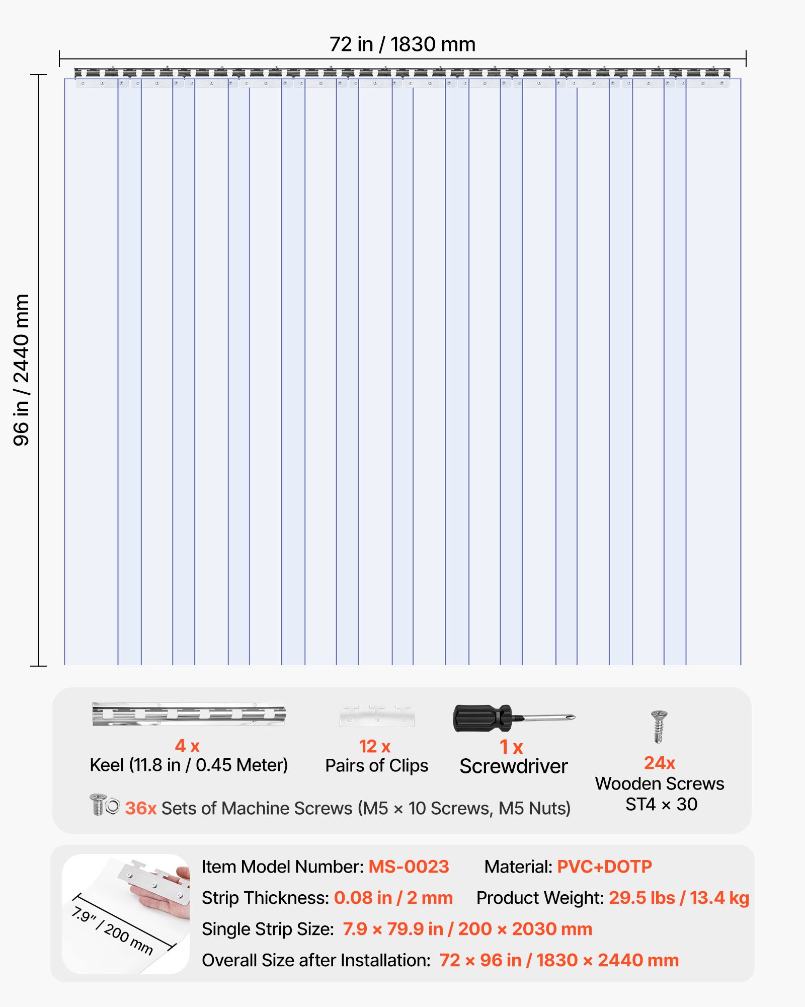 VEVOR trakasta zavjesa, visina 243 cm x širina 182 cm, debljina 0,2 cm, 12-dijelna prozirna PVC trakasta zavjesa za vrata, zavjesa za zamrzivač, plastične trake za vrata za zamrzivače, hladnjake i skladišne prostore, s 50% preklapanja