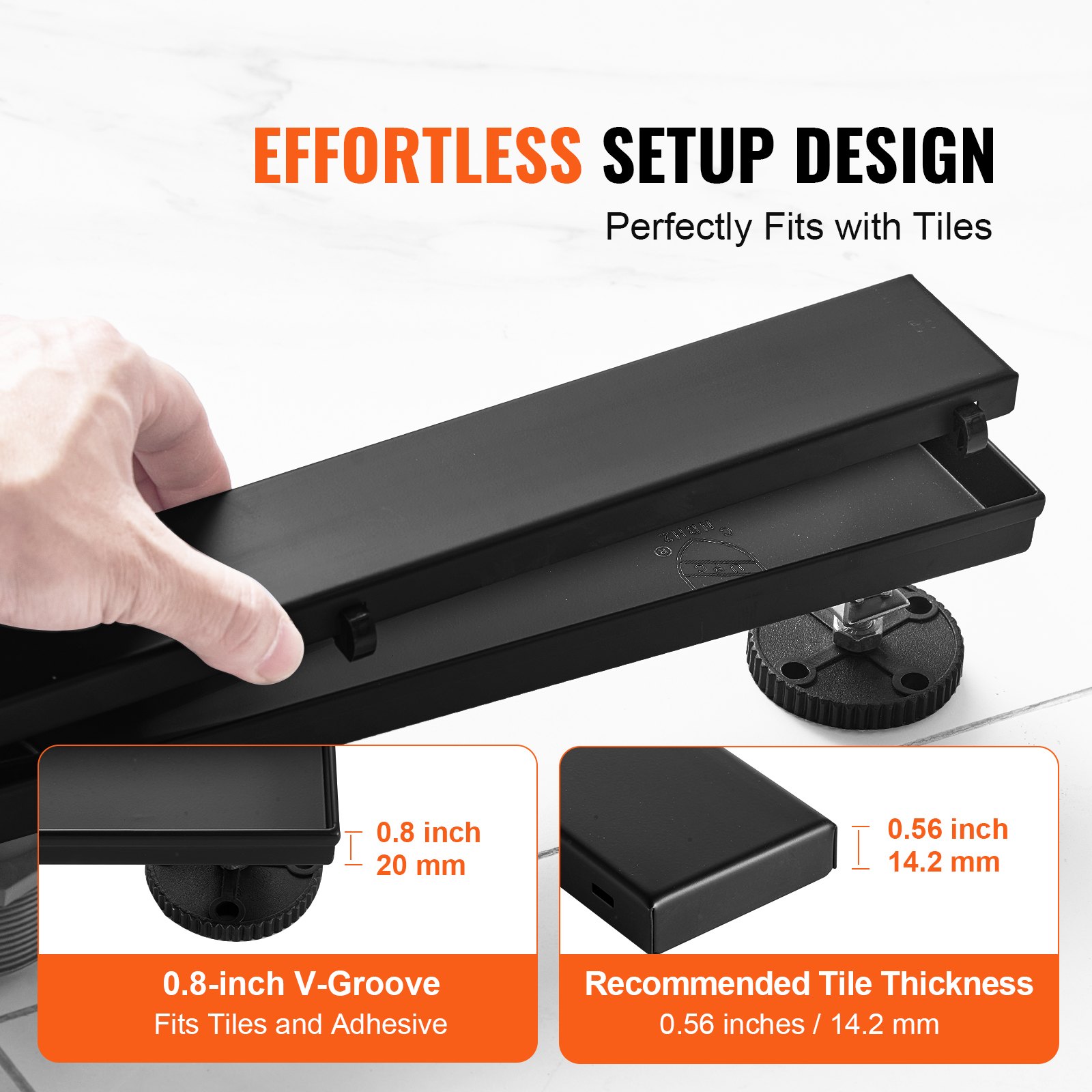 VEVOR odvod za tuš 609 x 70 x 70 mm Podni odvod 42,5 L/min Odvodni kanal od nehrđajućeg čelika 304 s pomaknutim odvodom za tuš s umetkom za pločice Pravokutni podni odvod za tuš Elegantni odvod s hvatačem dlačica Crni