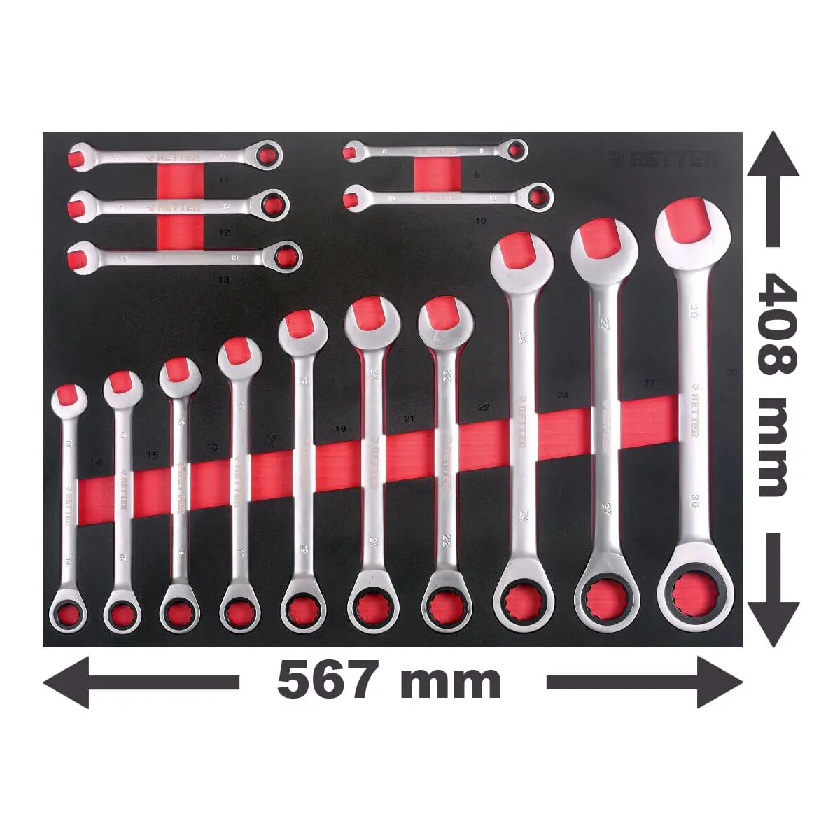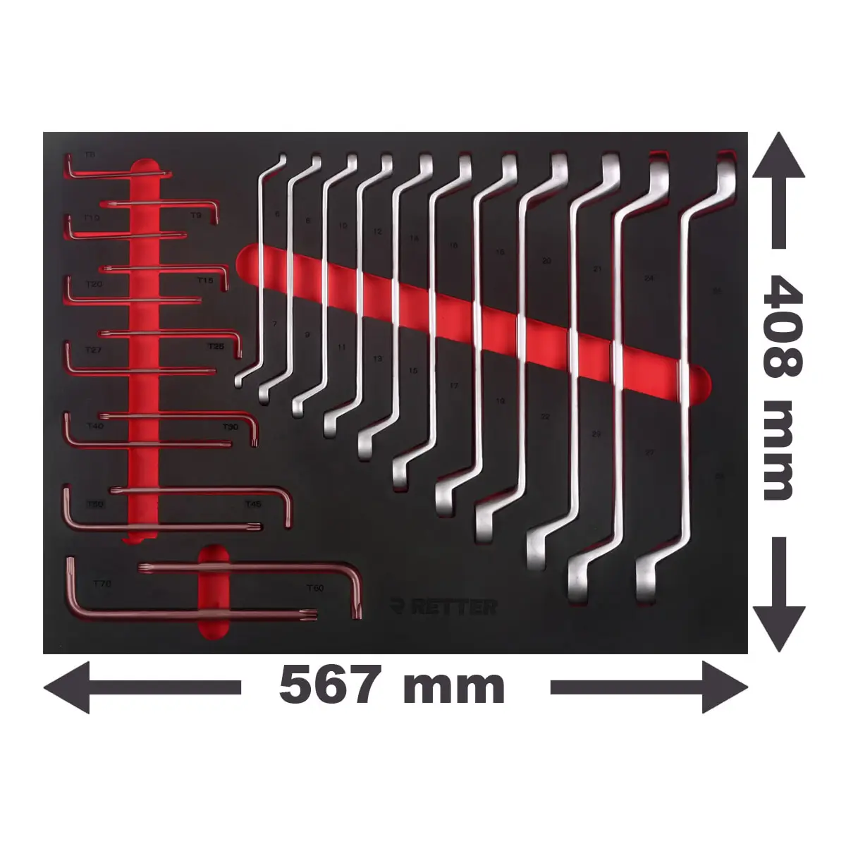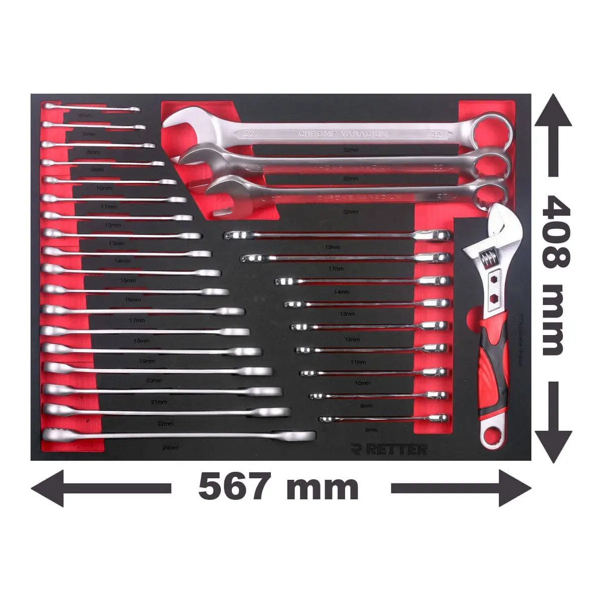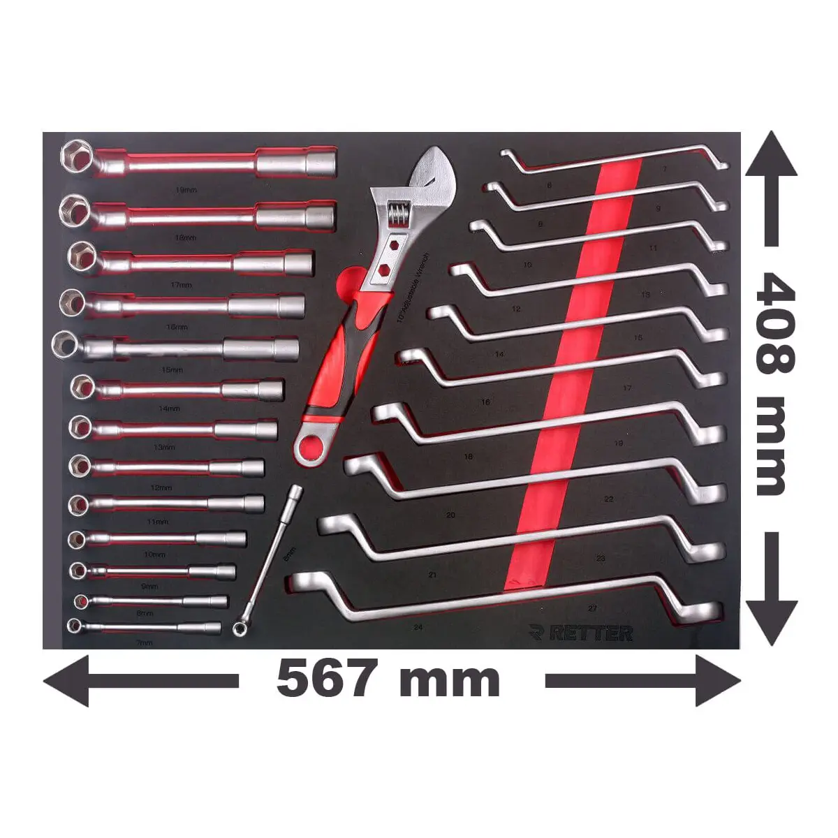 8 dvostrukih okastih ključeva: SW 6 x 7 – 8 x 9 – 10 x 11 – 12 x 13 – 14 x 15 – 16 x 17 – 18 x 19 – 20 x 22 mm 17 okastih ključeva s otvorenim krajem: SW 6 – 7 – 8 – 9 – 10 – 11 – 12 – 13 – 14 – 15 – 16 – 17 – 18 – 19 – 22 – 24 – 27 mm 10 dvostrukih okastih ključeva, duboko savijenih: SW 6 x 7 – 8 x 9 – 10 x 11 – 12 x 13 – 14 x 15 – 16 x 17 – 18 x 19 – 20 x 22 – 21 x 23 – 24 x 27 mm hladno kovani kutni okasti kraj
